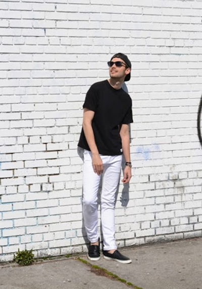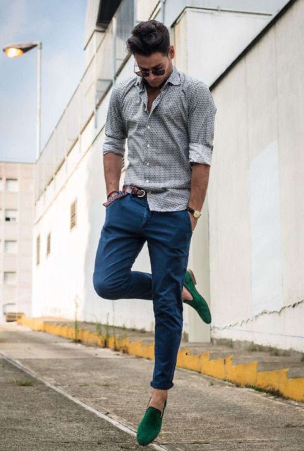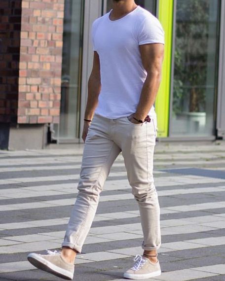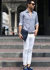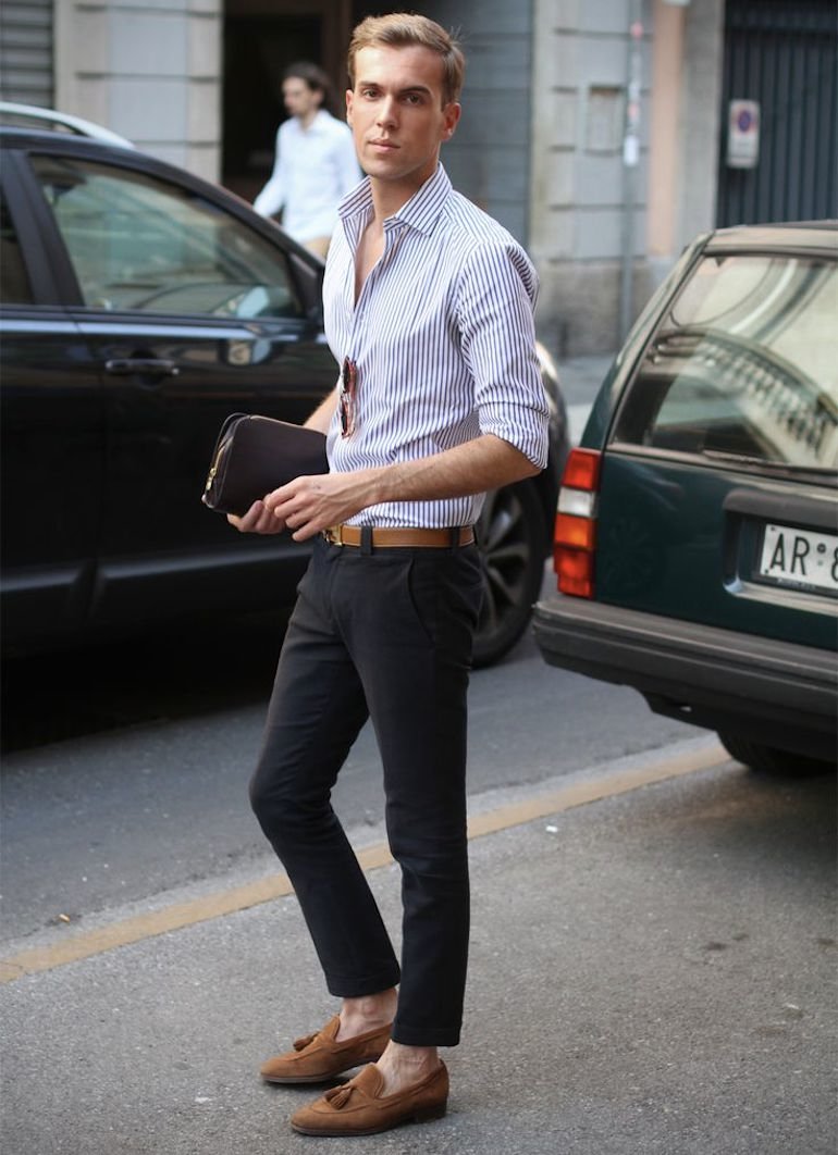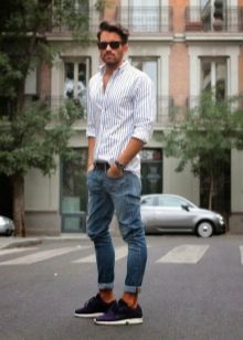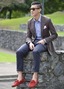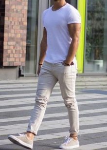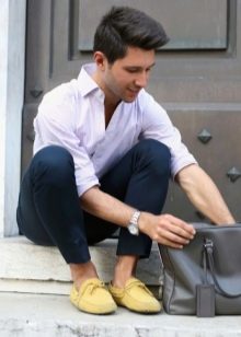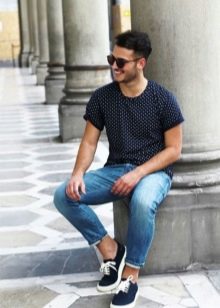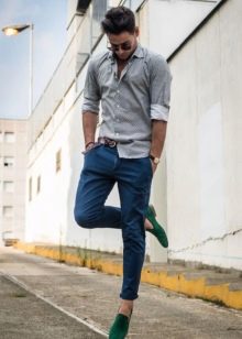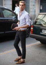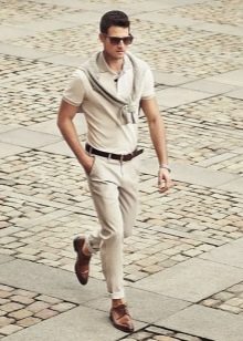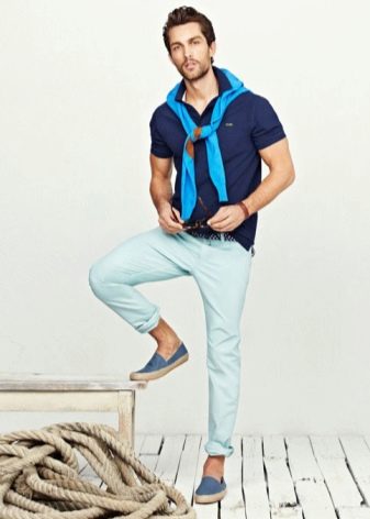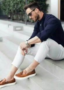 Hosen aus leichten Leinen- oder Baumwollstoffen sowie gewöhnliche Jeans sehen mit dieser Schuhvariante am harmonischsten aus. Sie sollten oben ein T-Shirt tragen, aber Hemden sehen nicht ganz angemessen aus.