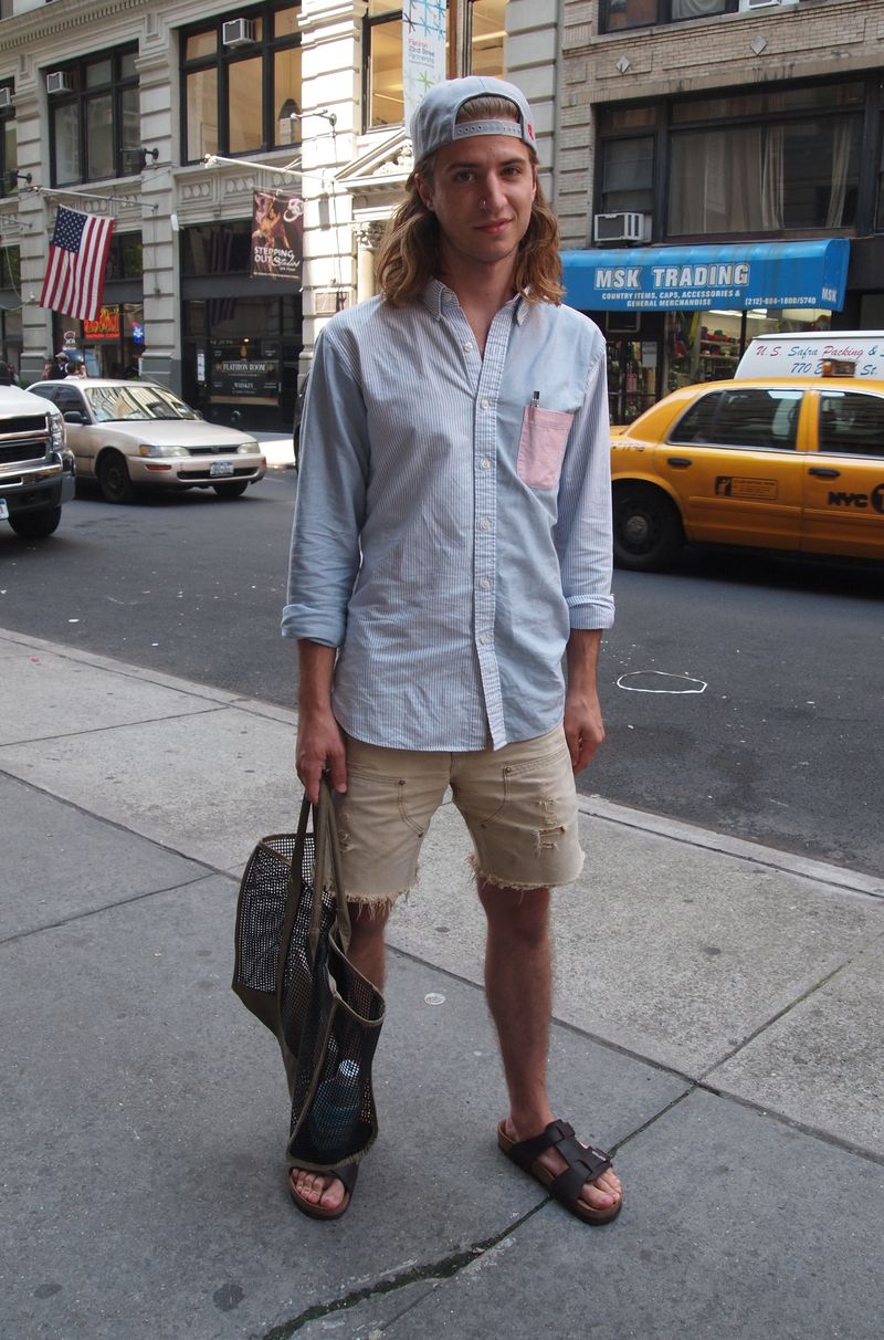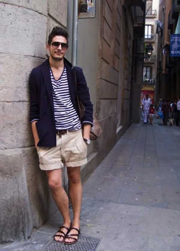 Streetstyle in seiner traditionellen Inkarnation. Teure Pantoletten mit Korksohle und ein beige-sandiges Leder-Obermaterial machen die Bomberjacke und Shorts zu einem Teil des frechen Looks.