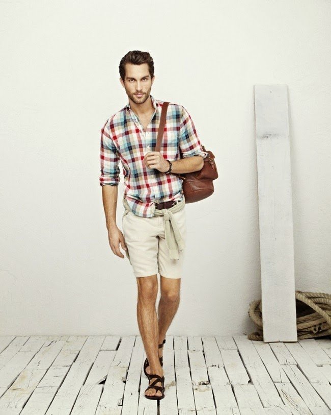 Modischer Bogen für die Jungen und Wagemutigen. Ein helles Shirt mit lässig hochgekrempelten Ärmeln, Shorts mit Fransensaum und eine Öko-Tasche werden durch strapazierfähige Pullover mit Pullover ergänzt.