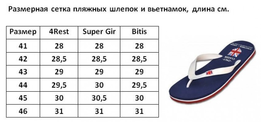 - Getreu der Größe. Die Abweichung sollte nicht mehr als 0,5 cm betragen.Es ist wichtig zu berücksichtigen, dass große Marken meist Clogs und große Flip-Flops haben. Es ist schwierig, im Massenmarktsegment nicht standardmäßige Optionen zu finden.