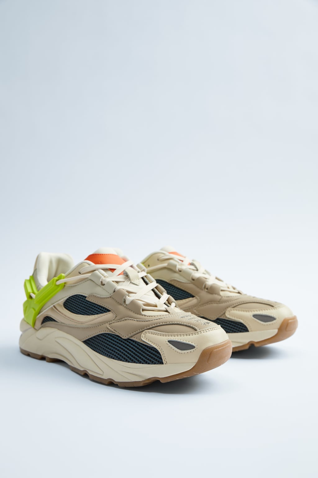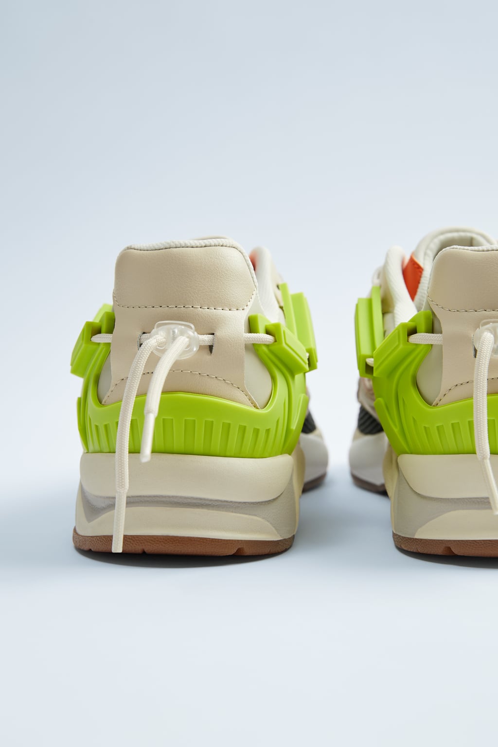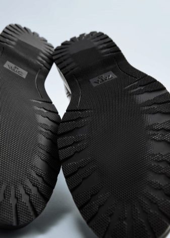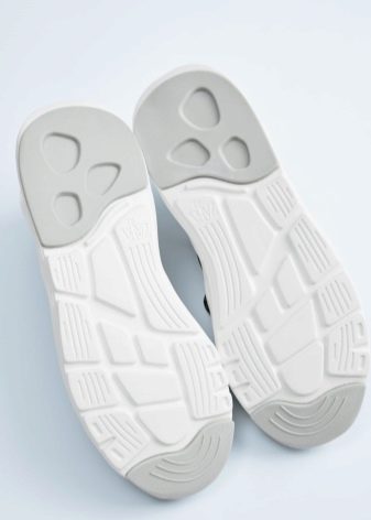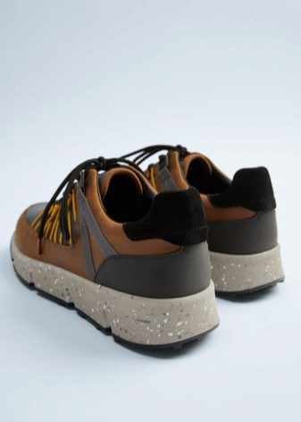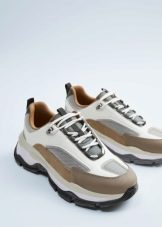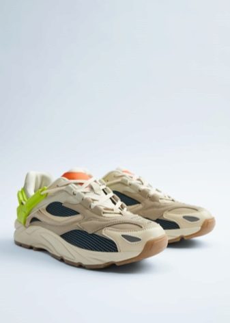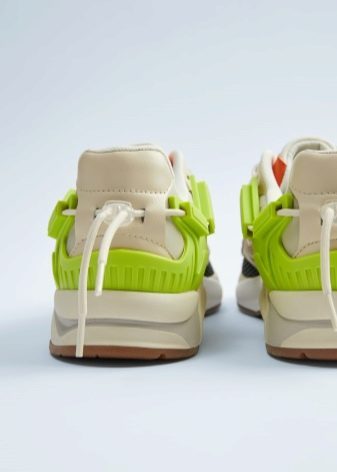 - Sneaker mit dicker Sohle mit dekorativen Einsätzen an der Ferse. Sie bestehen aus mehrfarbigen Materialstücken mit Netzeinschlüssen. Ausgestattet mit Doppelschnürung mit zehn Paar Ösen. Einer der Schnürsenkel verläuft entlang der Schuhkante, umgeht den grünen Einsatz und wird an der Fersenkappe befestigt. Die Sohle des Produkts ist dick, beige, weiß oder karamell.
