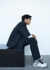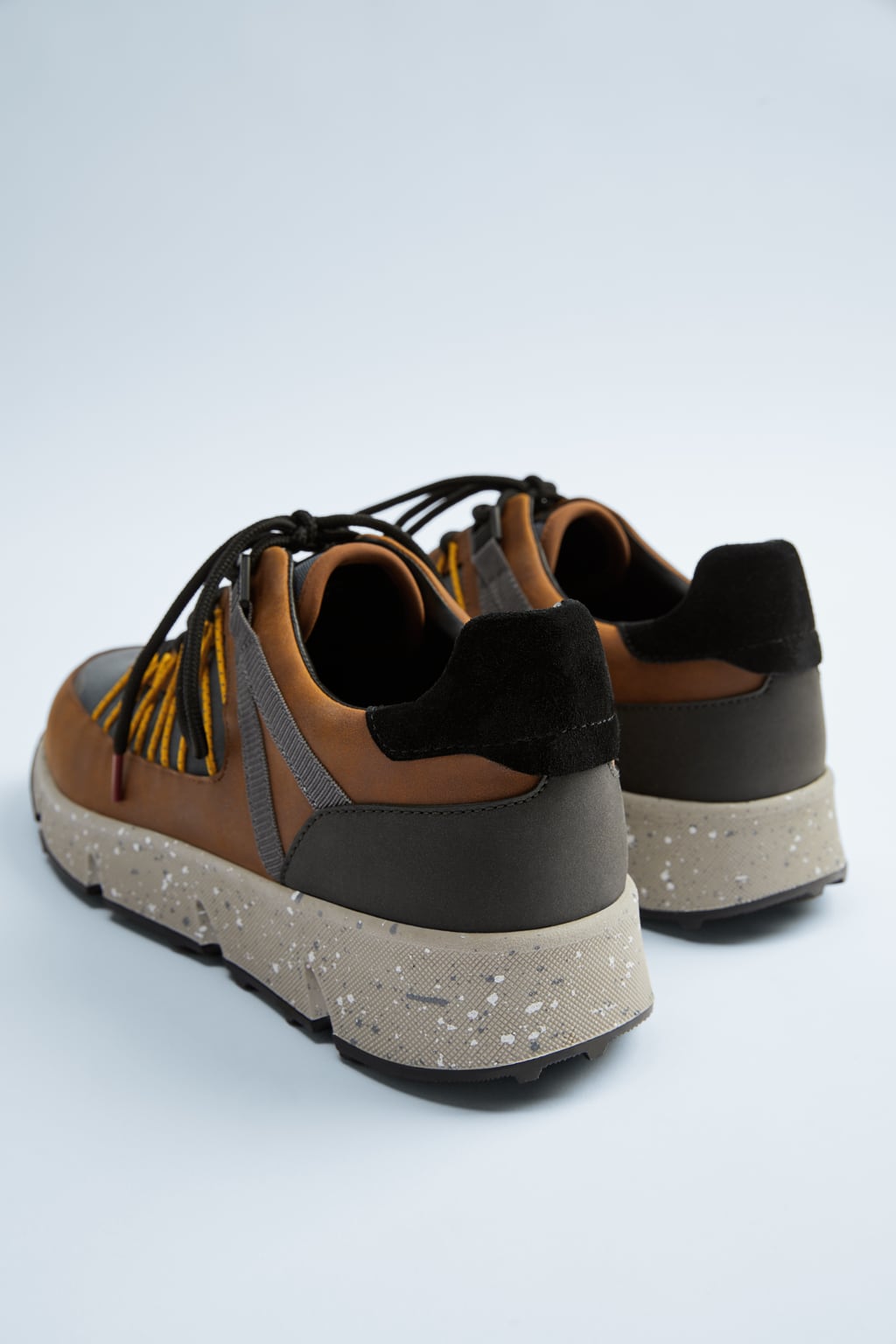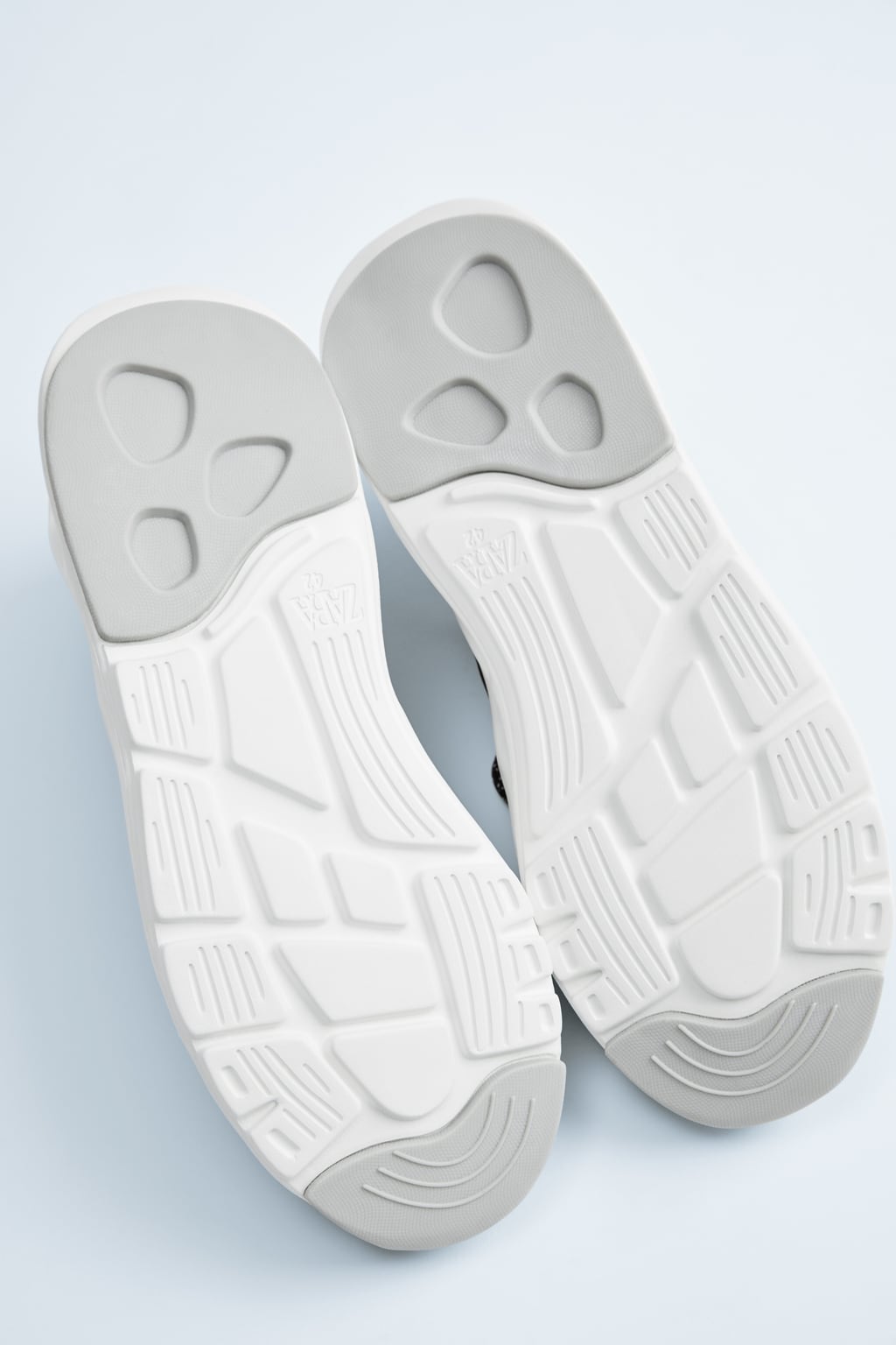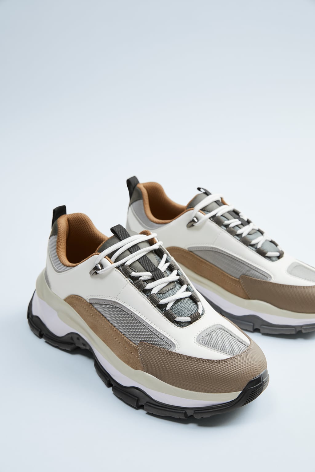 - Sneaker mit dicker Sohle mit dekorativen Einsätzen an der Ferse. Sie bestehen aus mehrfarbigen Materialstücken mit Netzeinschlüssen. Ausgestattet mit Doppelschnürung mit zehn Paar Ösen. Einer der Schnürsenkel verläuft entlang der Schuhkante, umgeht den grünen Einsatz und wird an der Fersenkappe befestigt. Die Sohle des Produkts ist dick, beige, weiß oder karamell.