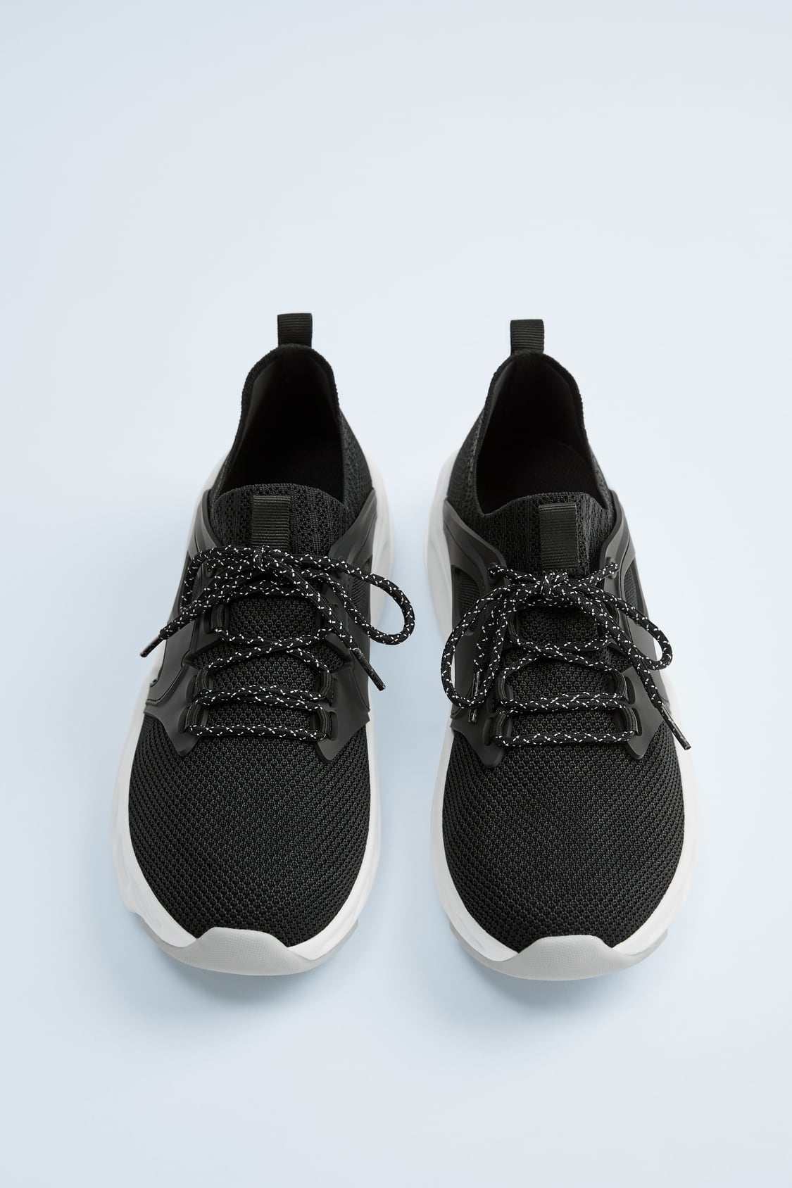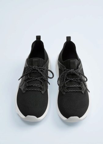 - Sportschuhe aus Hightech-Material mit 4 Paar Schnürösen. Ausgestattet mit einem schwarzen Tape an der Ferse, einer Zierschlaufe am Oberteil, Seitenelementen und einer weißen Sohle. Das Produkt selbst ist schwarz.
