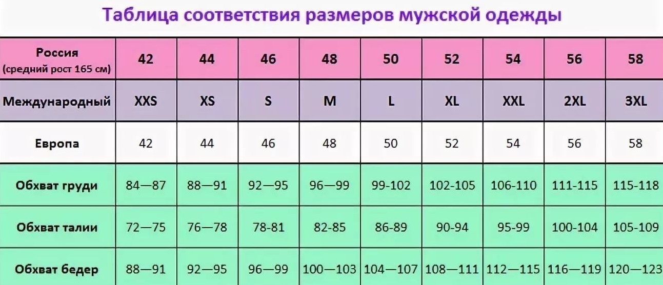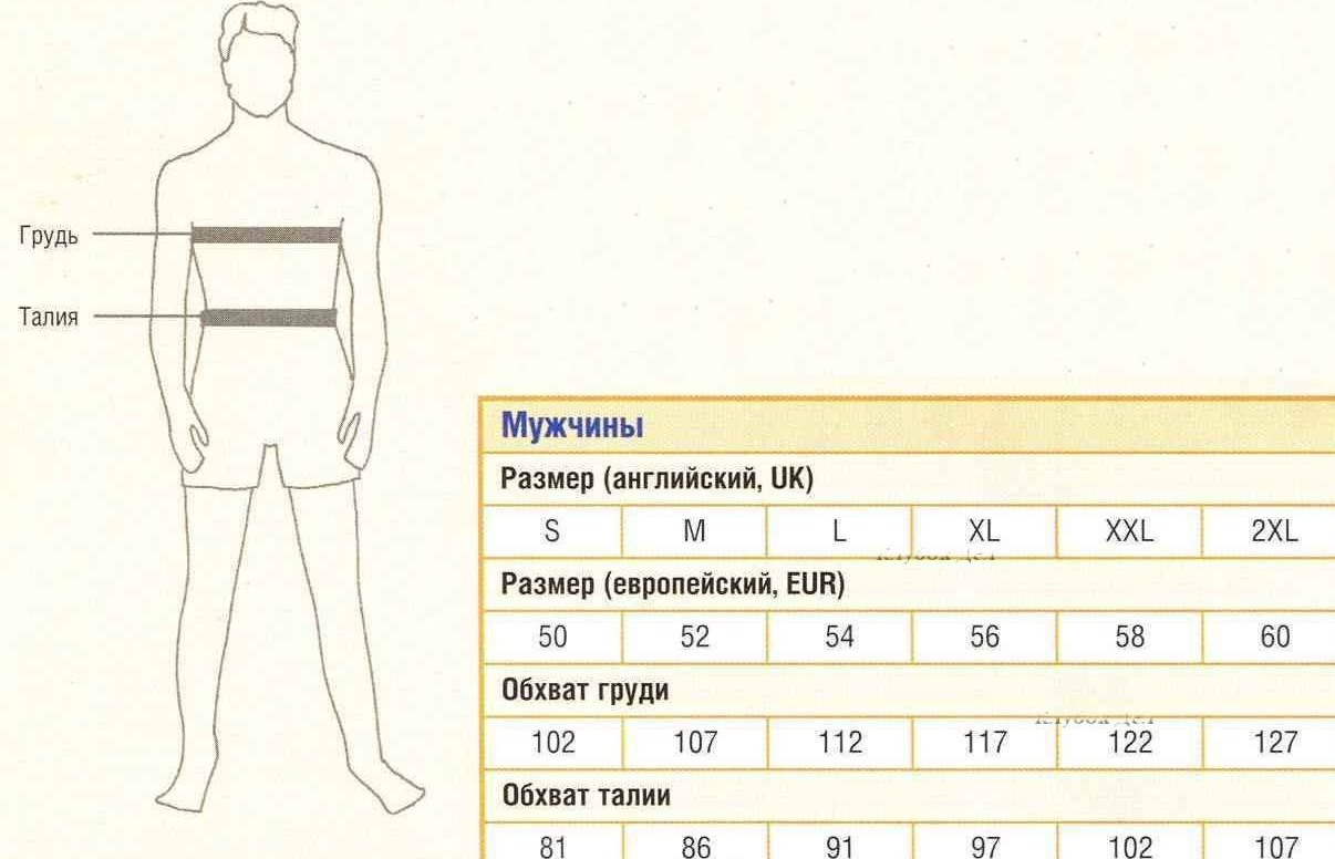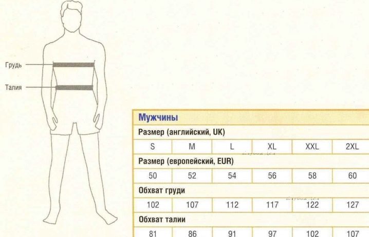 Es zeigt deutlich was Schriftzug wird verwendet, um die russische Größe anzuzeigen (durch Zahlen gekennzeichnet). Und auch im Diagramm sind Körperparameter angegeben, die einer bestimmten Größe entsprechen.