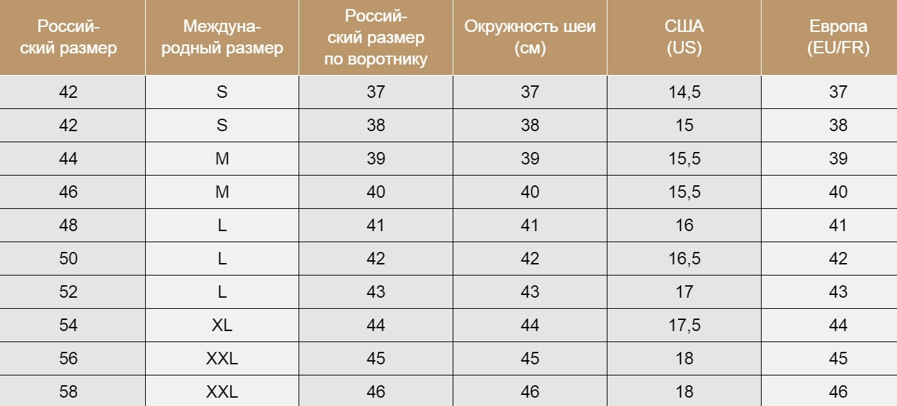 In diesem Fall ist bei der Auswahl der Kleidung das erste, was zu berücksichtigen ist Halsumfang. Überprüfen Sie die Tabelle unten und finden Sie Ihre Größe.