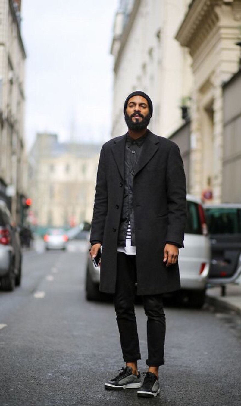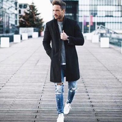 - ein gerader schwarzer Mantel wird den Look mit zerrissenen Jeans effektiv ergänzen;