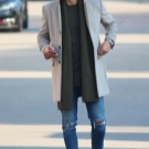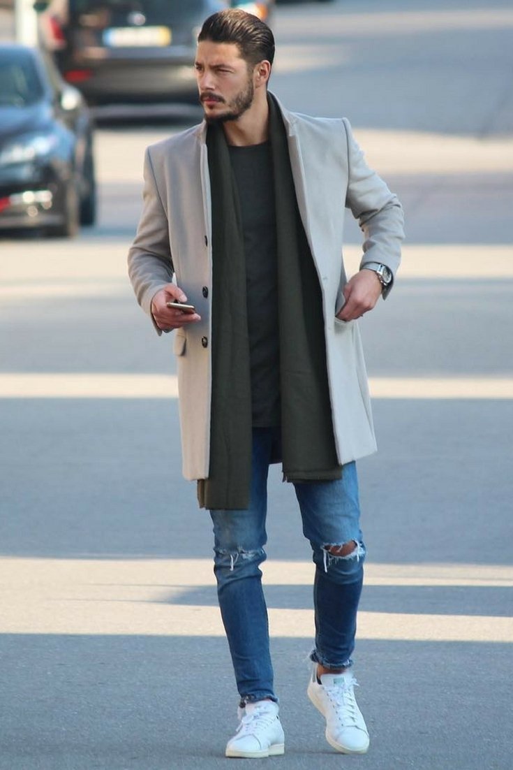 Schwarze Mokassins aus Wildleder, dunkle Leder-Loafer und klassische blau-weiße Converse-Sneaker passen zum Beispiel perfekt in das Ensemble, bestehend aus einem grauen Casual-Style-Mantel, einer dunklen Skinny-Jeans und einem hellen Sweatshirt.