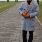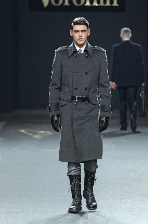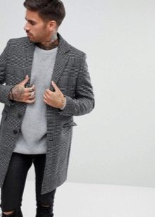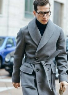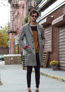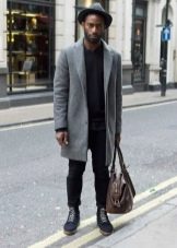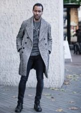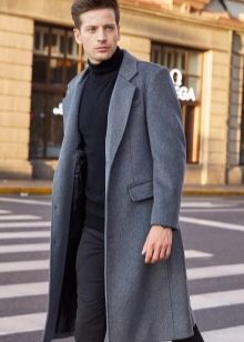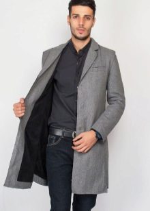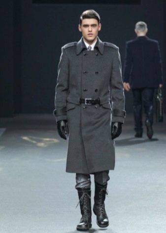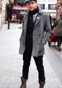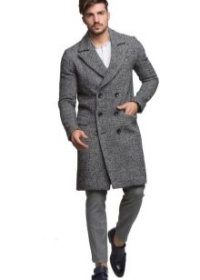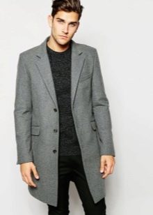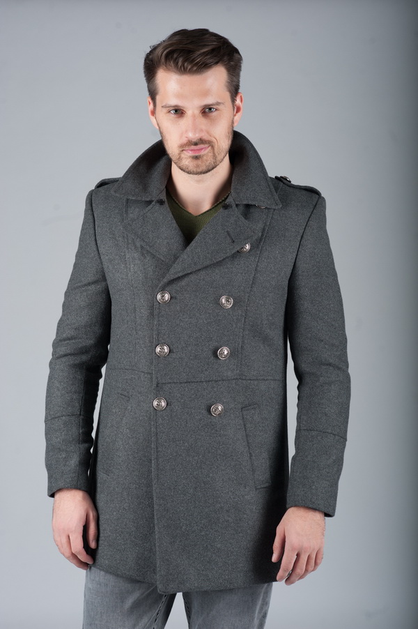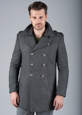 Für junge Männer und Männer mittleren Alters empfehlen Stylisten, Modelle von grauen Mänteln im sportlichen oder militaristischen Stil in Betracht zu ziehen. Sie sind ideal für informelle Veranstaltungen, Stadtspaziergänge, Ausflüge. Solche Modelle können ziemlich kurz sein (etwa eine Handfläche über dem Knie). Diese Länge bietet Bewegungsfreiheit und Komfort beim Fahren.