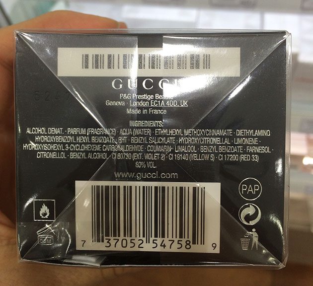 Das Original kann durch den sogenannten Chargencode oder Chargennummer unterschieden werden. Dies ist ein numerischer Code, in dem das Produktionsdatum und das Ablaufdatum verschlüsselt sind. Ein Merkmal des Gucci Chargencodes ist, dass er nicht nur auf der Verpackung, sondern auch auf dem Parfümflakon selbst angebracht ist. Es ist wichtig, dass die Nummer auf der Verpackung mit der Nummer auf der Flasche übereinstimmt. Bei einer Fälschung kann der Chargencode entweder nicht übereinstimmen oder auf der Flasche oder Schachtel fehlen. Sie müssen die Seriennummer entweder am Boden oder an der Seite des Parfümflakons suchen.