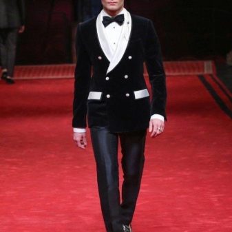 Die schwarze Samtjacke für Herren ist der Inbegriff von Feierlichkeit und Feier. Dieses Kleidungsstück wird oft bevorzugt von Menschen mit kreativen Berufen getragen - Sängern, Theaterbesuchern, Dirigenten, Musikern, Zirkusartisten. Manchmal ergänzen Schauspieler ihre Bilder mit einem solchen Element und betreten den roten Teppich. Im Alltag ist ein solches Outfit unangemessen.