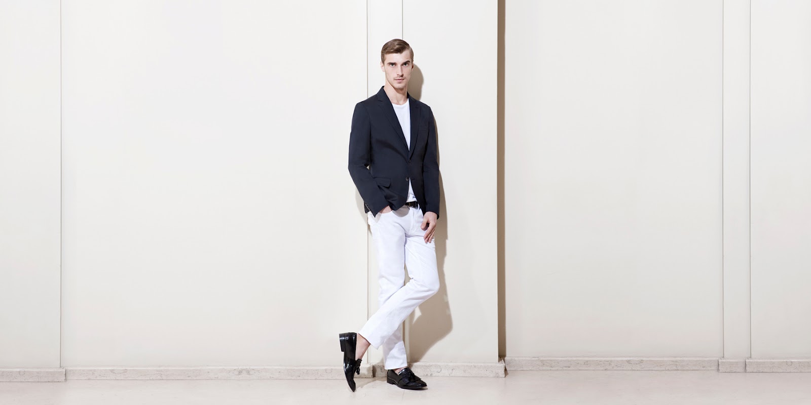 Leichte Hosen lassen sich gut mit einer klassischen Jacke kombinieren, aber das Image im Allgemeinen sollte nicht geschäftsmäßig sein. Anstelle eines Hemdes können Sie beispielsweise ein enganliegendes T-Shirt oder Langarmshirt tragen. Für Schuhe können Sie Loafer oder modische Mokassins kaufen.