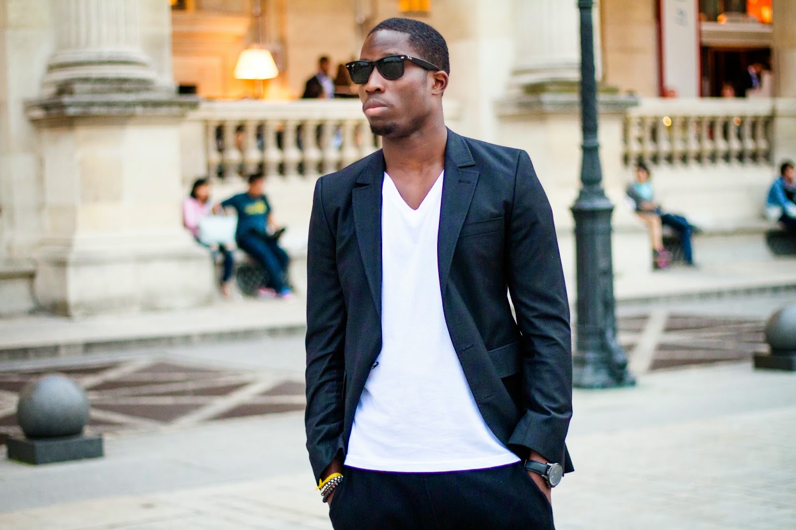 - Ein Beispiel, wie Sie einen schwarzen Herrenblazer mit einer helleren Hose kombinieren können. Longsleeve in Weiß mit V-Ausschnitt betont die Männlichkeit und den massiven Hals des Models. Weiße Sportschuhe machen den Look nicht nur moderner und stylischer, sondern auch bequemer.