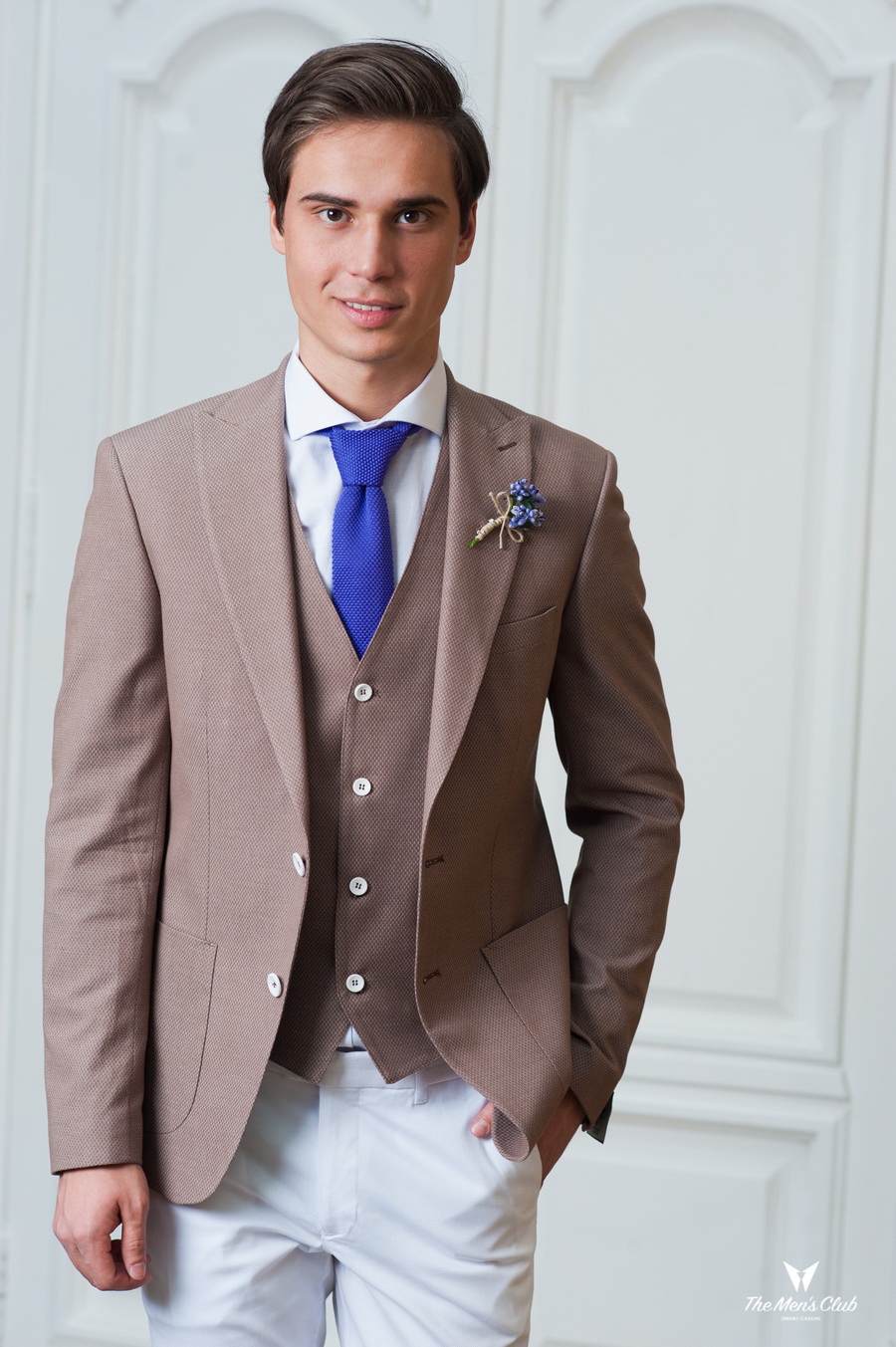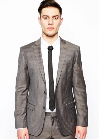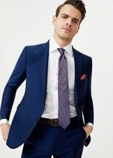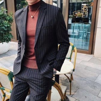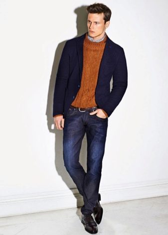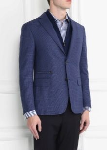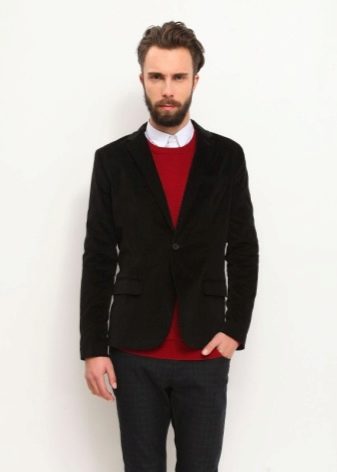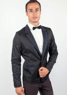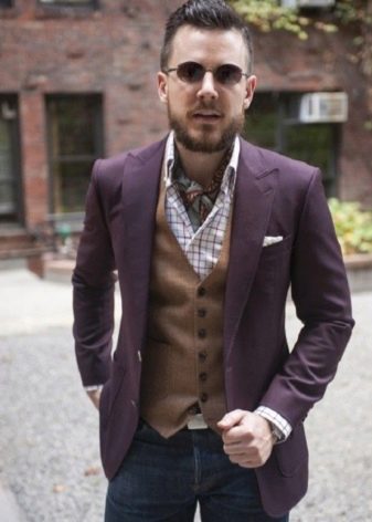 Wurde ein Zweiteiler gewählt, kann dieser sowohl zu klassischen Hosen als auch zu Jeans getragen werden. Ein weißes Hemd wird mit einem solchen Ensemble harmonisch aussehen, ebenso wie eine Fliege, die in ihrem Schatten mit einer Zwei widerhallt.