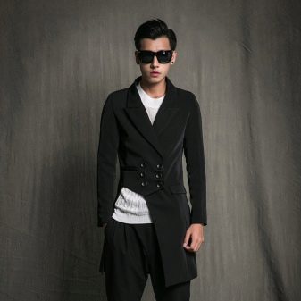 - Für extravagante Herren eine Option wie ein Produkt asymmetrische Passform... Die dem Design zugrunde liegende Asymmetrie macht das Outfit wirklich originell, auch wenn die Jacke in beruhigenden Farben gehalten ist. Meistens sind solche Linien in einem ungewöhnlichen Geruch oder Jackenrevers verkörpert.
