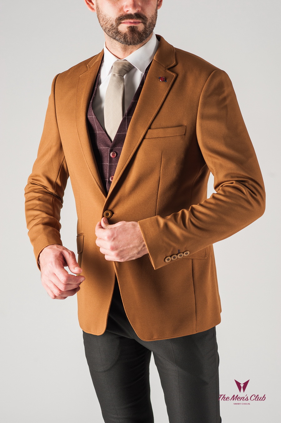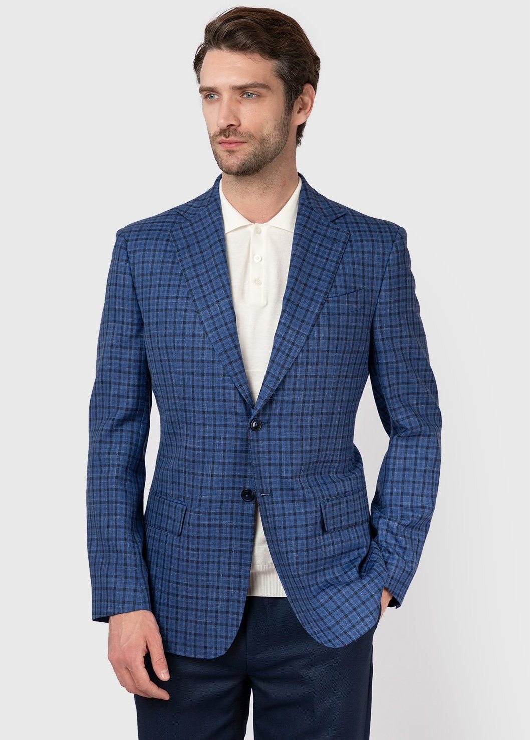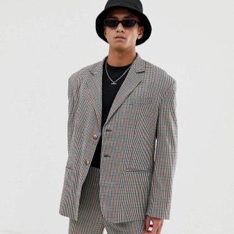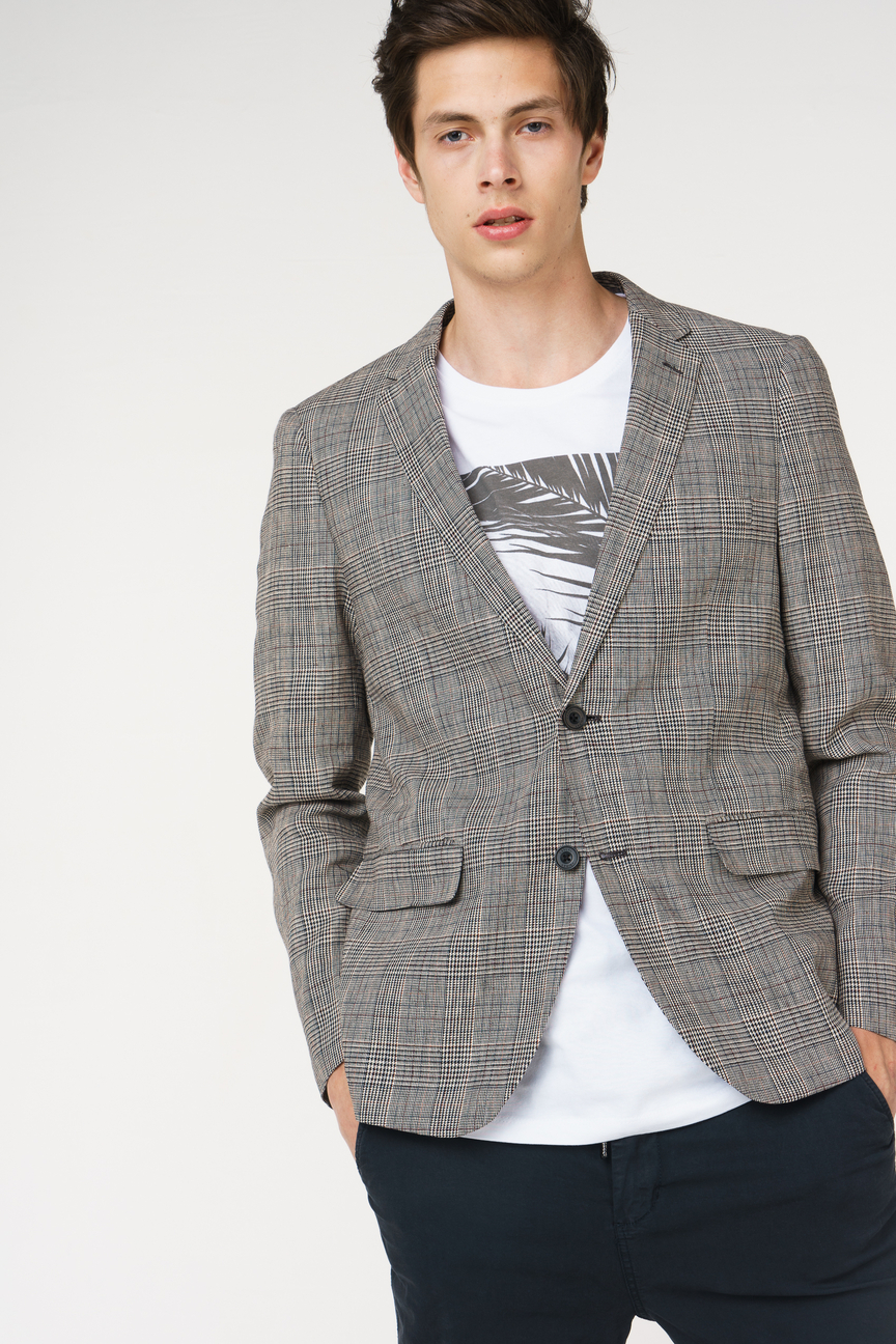 - Ein klassisches großformatiges Karo ergänzt eine einreihige Jacke in dezenten Tönen.