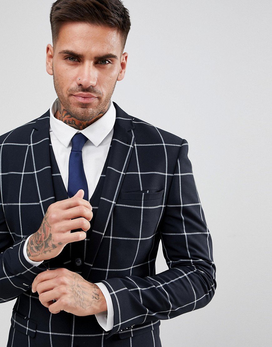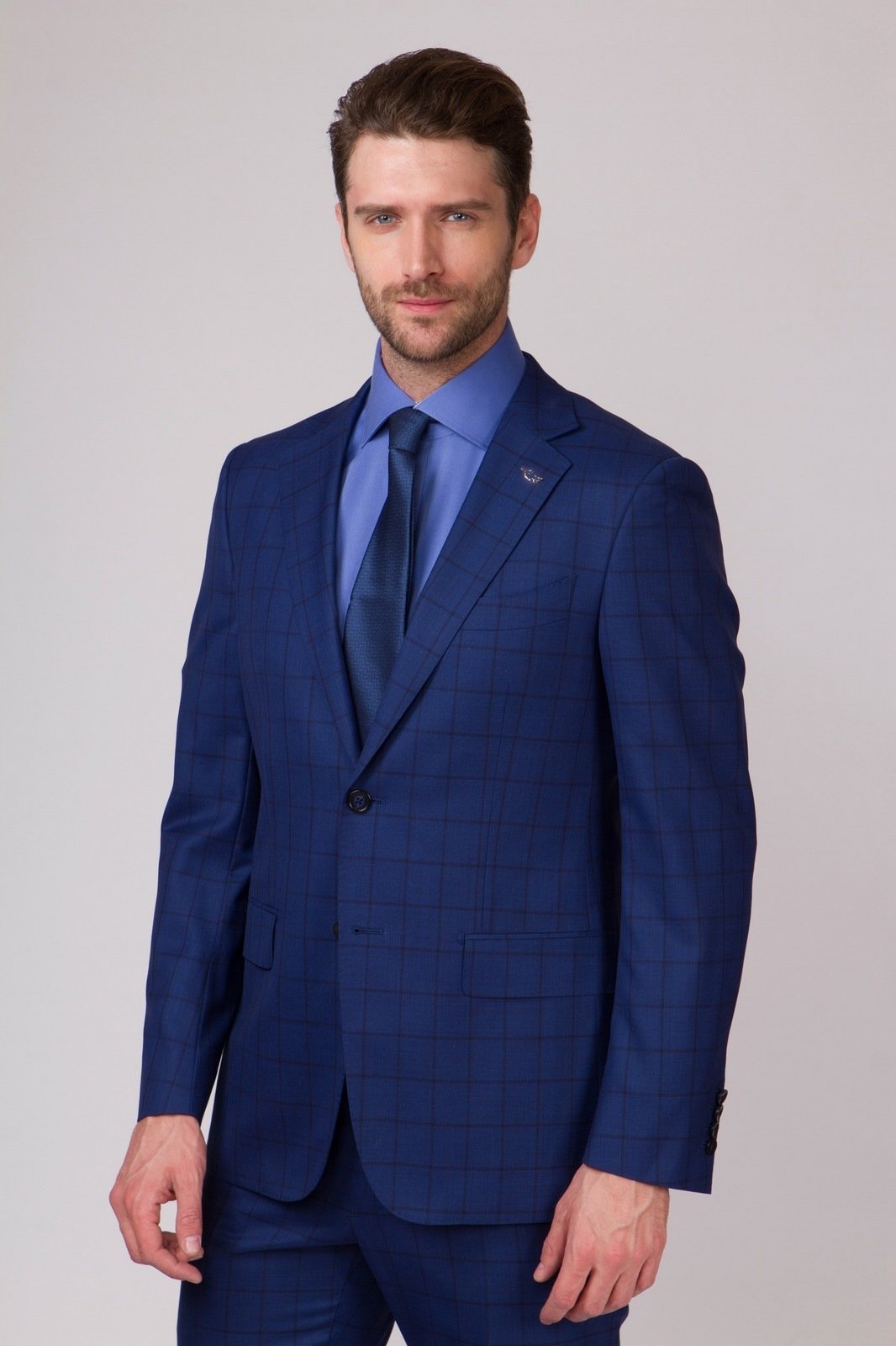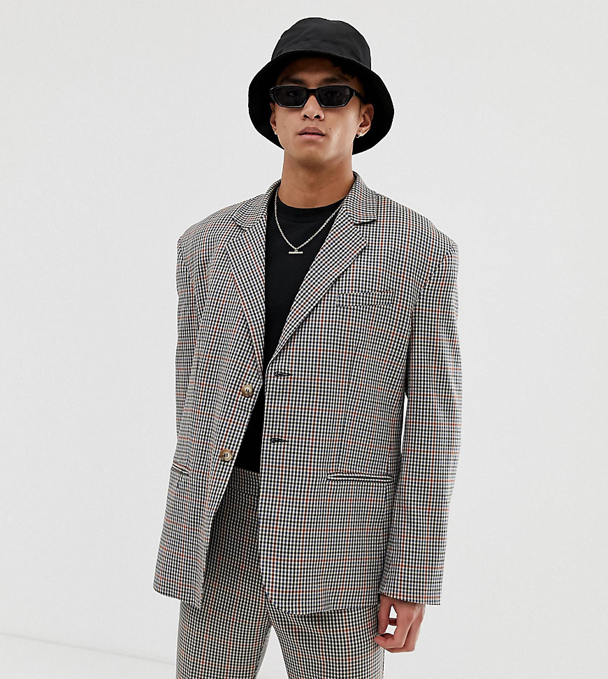 - Ein klassisches großformatiges Karo ergänzt eine einreihige Jacke in dezenten Tönen.