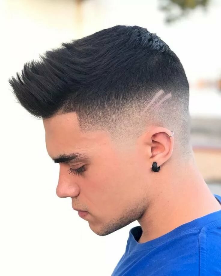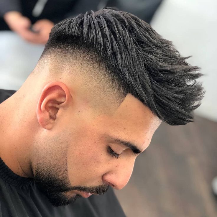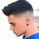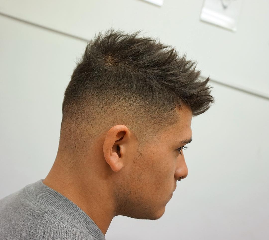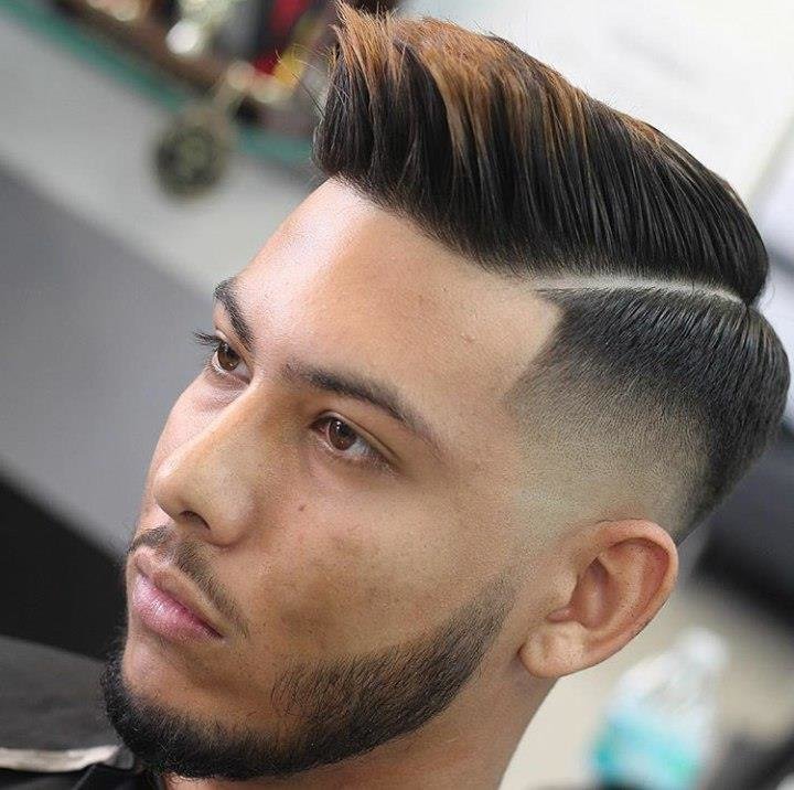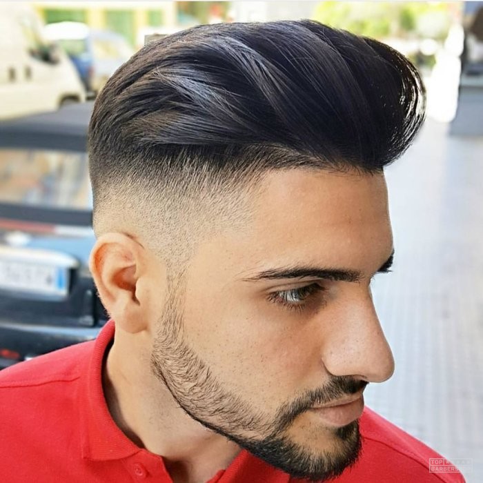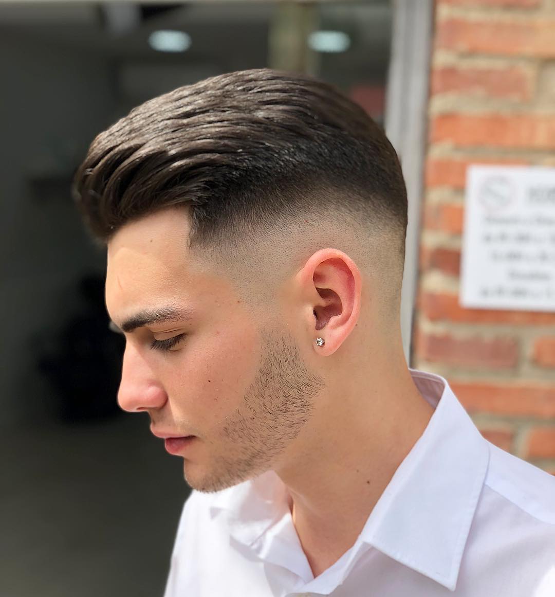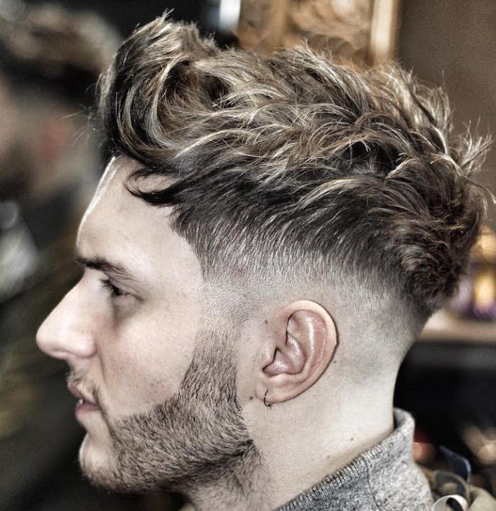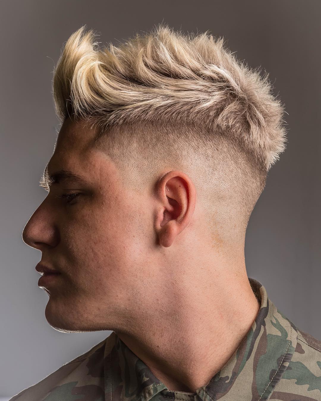 - "Fade" hoch stellt eine Frisur dar, die sich unter anderem durch einen scharfen Übergang auszeichnet. Der Unterschied zwischen kurzen und langen Haaren ist sehr auffällig. Der Nacken und die Schläfen sind fast auf Null geschnitten, aber am Scheitel bleiben sie lang.