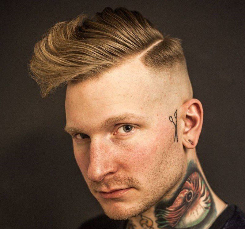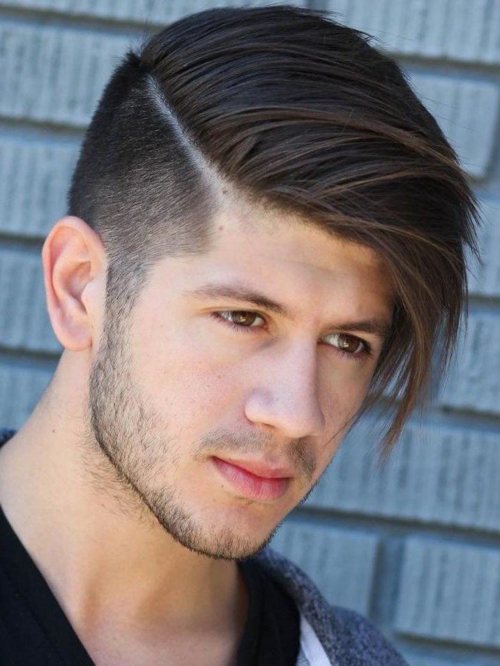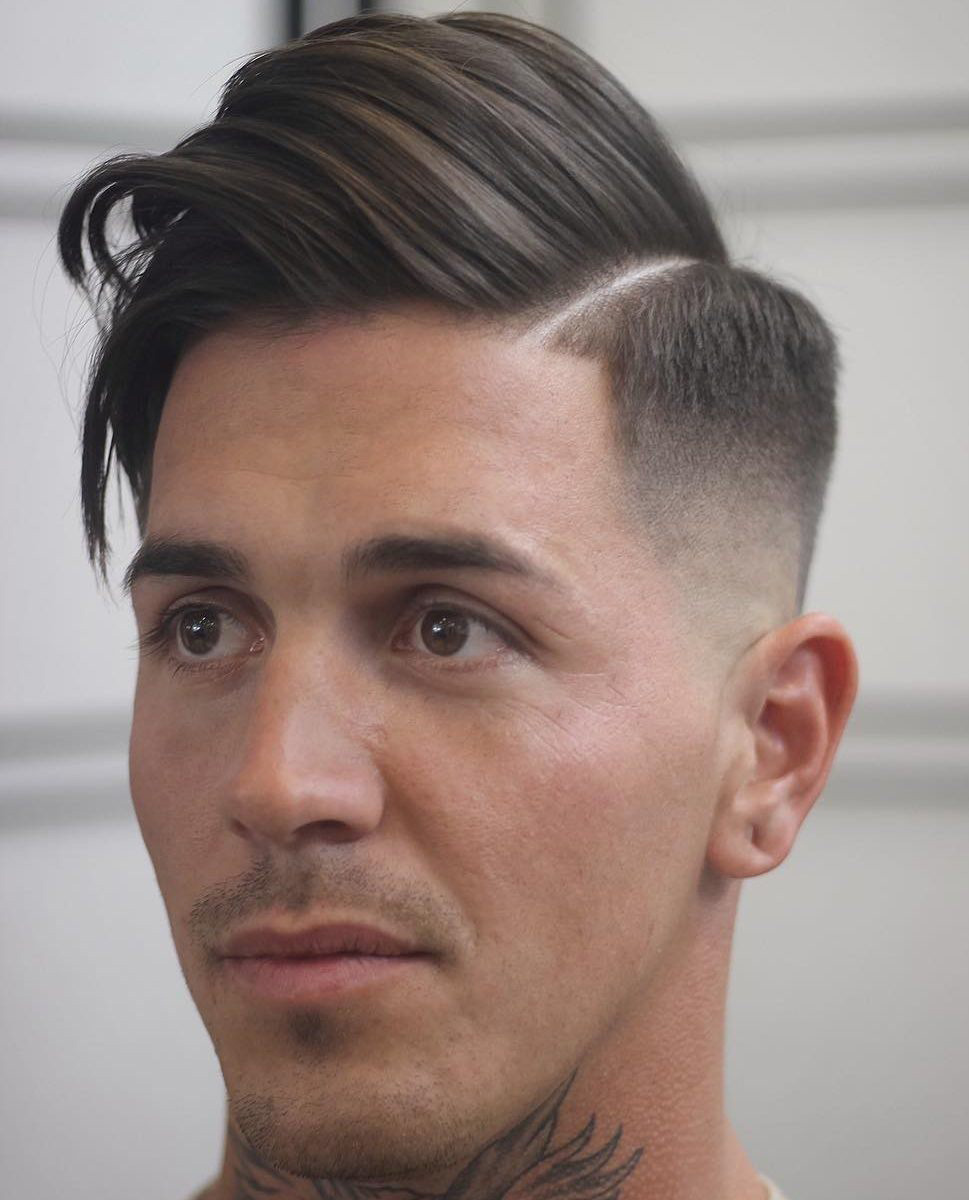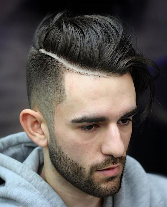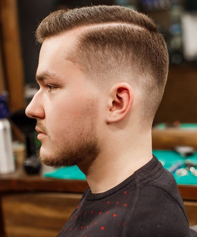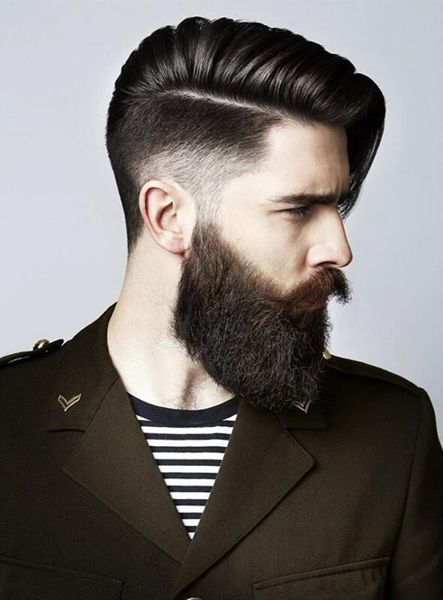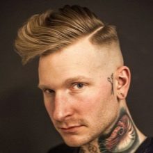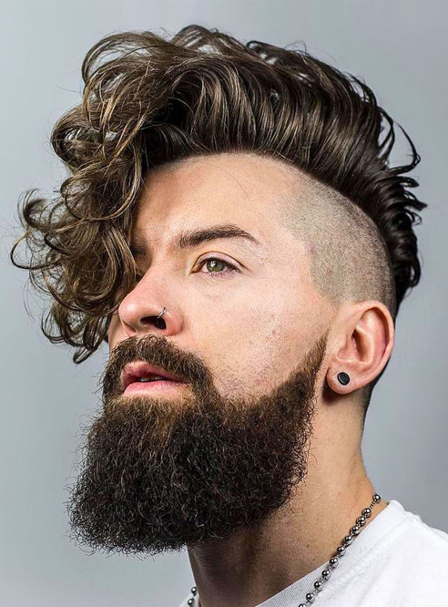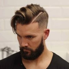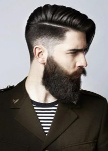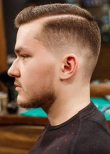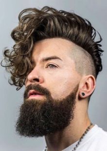 - Seitenfrisur mit rasierten Schläfen... Diese Art von Haarschnitt ist sehr einfach und passt gut zu einem gepflegten Bart. Wenn der Kunde es wünscht, kann der Stylist dem rasierten Kopf oder Whisky ordentliche Muster hinzufügen.