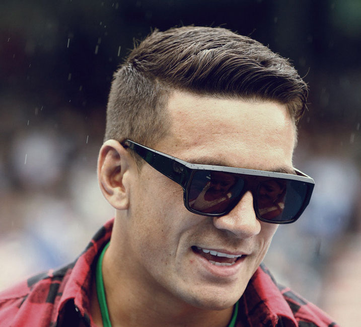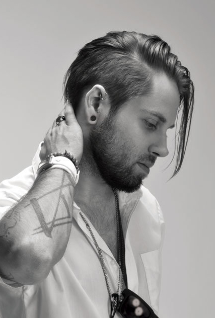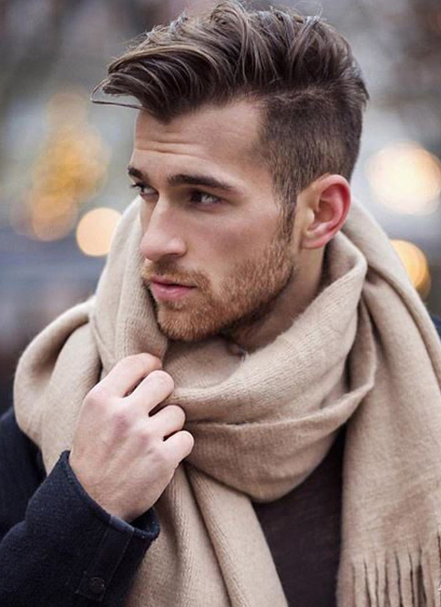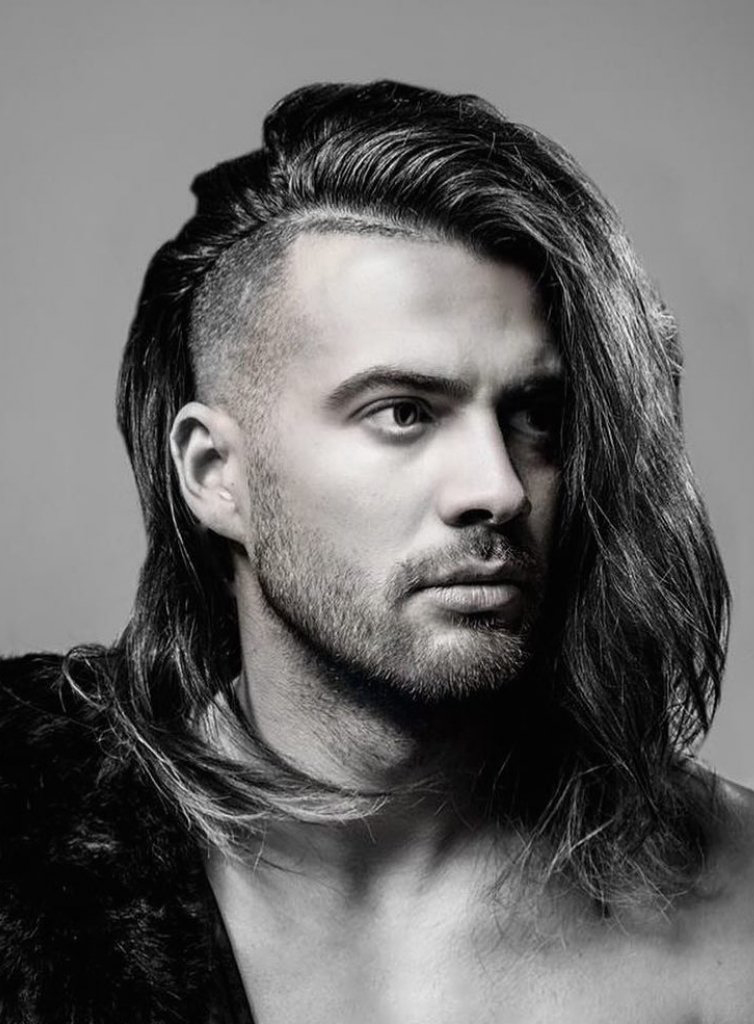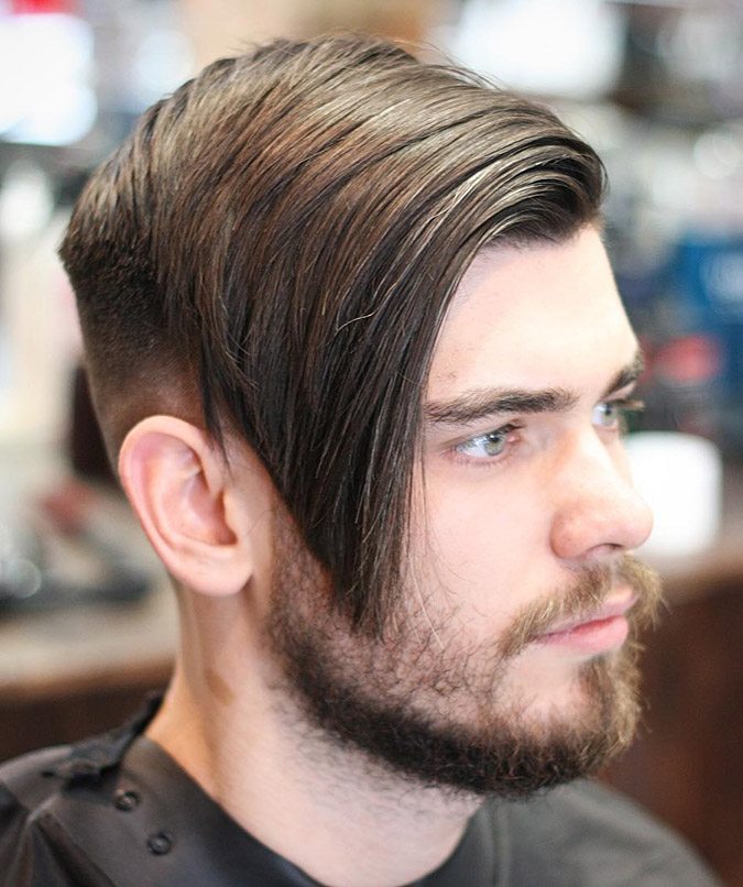 Am häufigsten wird diese Option von selbstbewussten Männern gewählt. Dazu müssen die Haare auch gut gewaschen und getrocknet werden. In diesem Fall werden die Schläfen und der Hinterkopf am häufigsten rasiert, daher müssen die Haare auf der Krone zur Seite geworfen werden, damit sie direkt über dem Gesicht hängen. Danach müssen sie mit einem Stylingmittel fixiert werden. Dies wird dazu beitragen, dass Ihr Haar den ganzen Tag über so aussieht. Dieses Styling wird in Kombination mit einem Bart besonders schön aussehen.