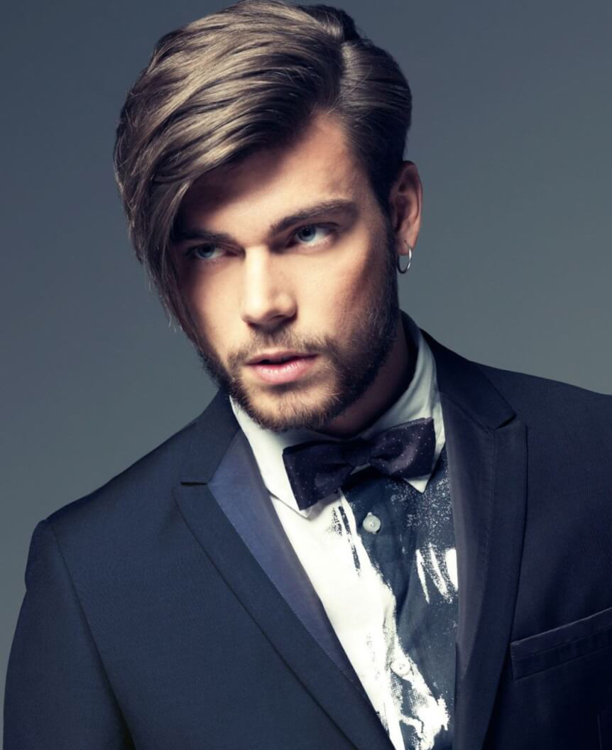 Darüber hinaus sollten anständige Männer klassischen Haarschnitten mit gleichmäßigem Scheitel den Vorzug geben. Aber für junge Männer können Sie auf Haarschnitte mit asymmetrischem Pony, rasierten Schläfen und länglichen Strähnen achten.