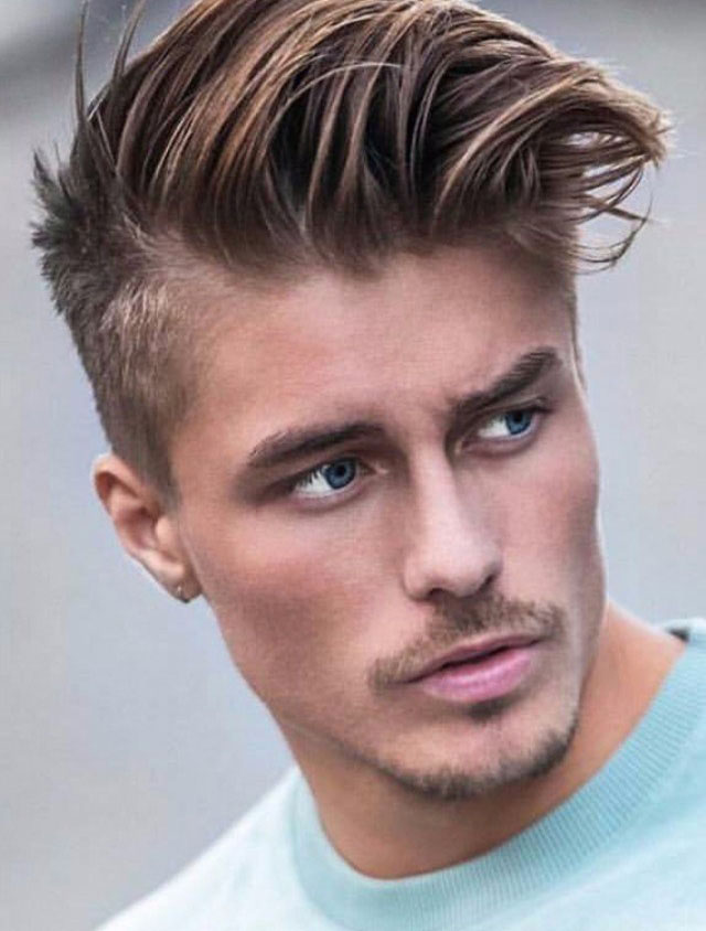 - Männer mit ovalem Gesicht müssen auf einen Haarschnitt mit einem länglichen Knall achten, der zur Seite gekämmt ist. In diesem Fall können der Hinterkopf und die Schläfen sehr kurz geschnitten oder rasiert werden.