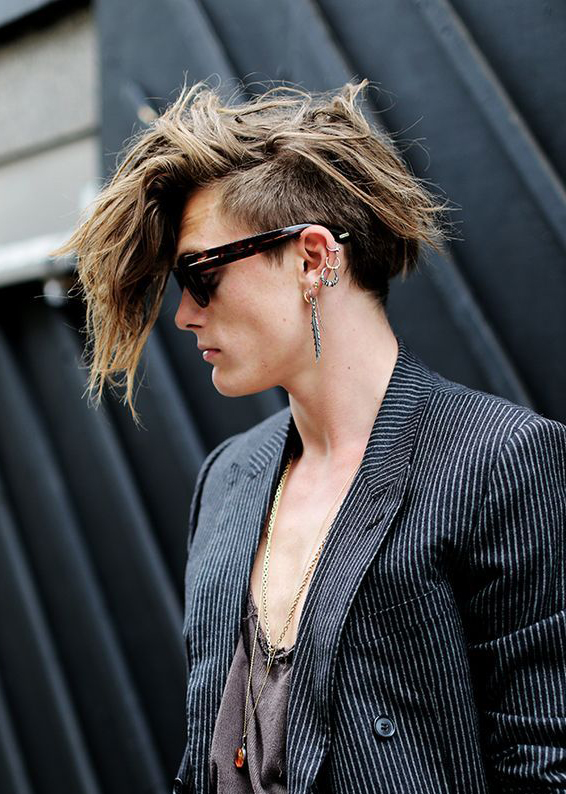 Mit langen Haaren können Sie eine Vielzahl von Frisuren machen. Es gibt viele Optionen, aber die beliebteste ist ein Hinterschnitt mit asymmetrischem Pony, langen Haaren ganz hinten am Kopf und einer rasierten Schläfe. Dadurch ist es möglich, die Strähnen zur Seite zu kämmen. Es ist für jeden geeignet, unabhängig vom Alter.