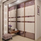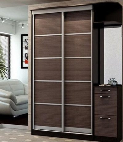 - Ein lakonischer Kleiderschrank mit brauner Fassade sieht ganz nett aus. Die Aufteilung dieser Fassade in Sektoren mit Streifen ist nicht nur praktisch, sondern auch optisch eine sehr gute Lösung.