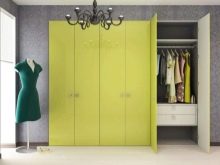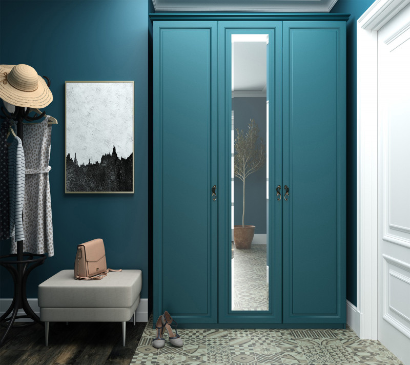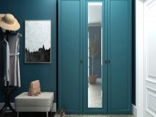 Der gelbe Kleiderschrank im Flur ist nicht die naheliegendste Lösung, aber seine Vorzüge sind unbestreitbar. Ein zu gesättigter Farbton lohnt sich kaum, relativ dezente Optionen passen jedoch definitiv ins Interieur. Manchmal ist auch ein blaues (genauer gesagt aqua) Objekt eine gute Wahl. Es sieht gut aus vor dem Hintergrund des Gesamtdesigns in der gleichen Farbe. Sie können auch versuchen, einen Schrank mit roter Front und weißem Korpus zu verwenden - es ist logisch, wenn alle anderen Gegenstände im Raum im gleichen Geist hergestellt werden.