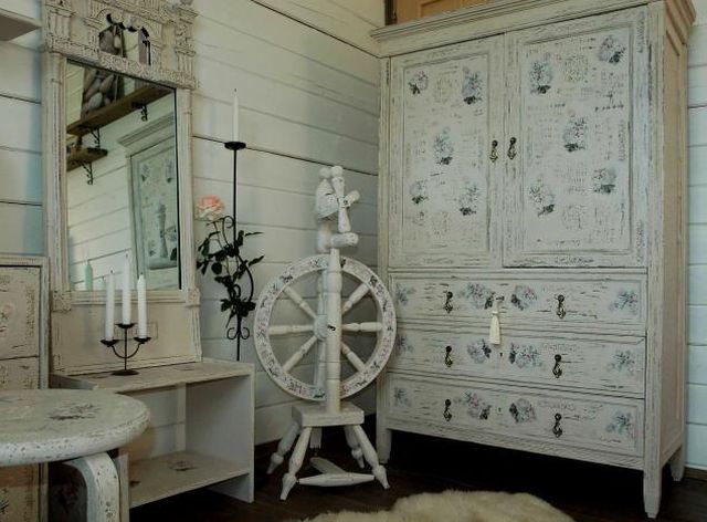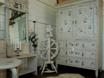 Der Shabby-Chic-Ansatz betont die optische Abnutzung der Dinge - Es ist jedoch inakzeptabel, die Grenze zu überschreiten, wo sie unangenehm werden. Oft werden Möbel in einem betont antiken Look verwendet.