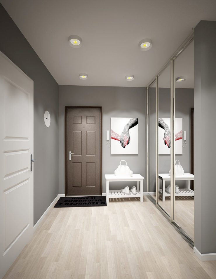 Flure haben in den meisten Fällen keine Fenster. Daher wird es notwendig, diese Lücke zumindest teilweise auszugleichen. Die Lösung ist nur die Wahl der hellen Farben bei der Dekoration eines Raumes. Ein weiterer Vorteil ist die positive, emotional unterstützende Wahrnehmung eines solchen Raumes.