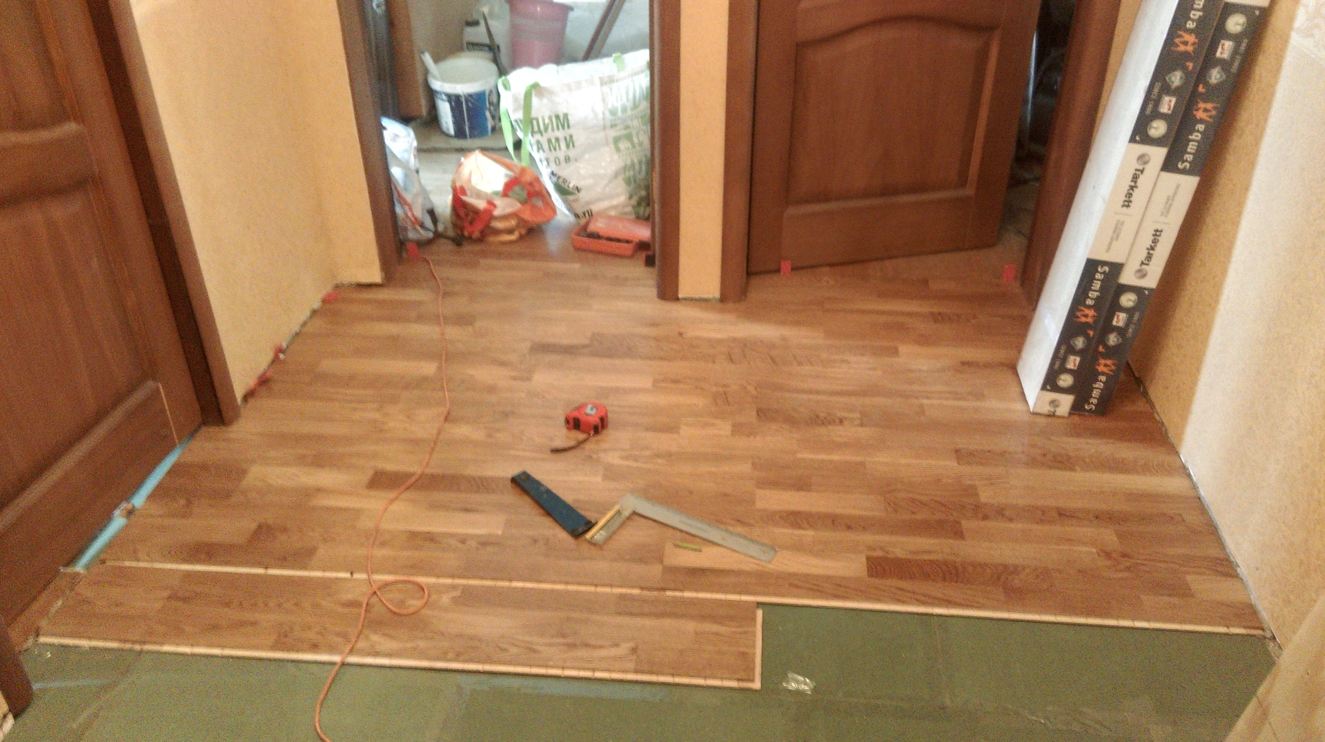 Damit Sie „siebenmal messen“, um sich nicht zu irren, legen Sie das Laminat ideal und kompetent in den Flur nahe der Haustür. Beim Verlegen des Laminats berücksichtigen die Bauherren verschiedene Nuancen und überlegen, wie sie am besten zur Haustür gelangen: entlang, quer, Fischgrät, diagonal. Sie beginnen mit dem Verlegen des Laminats aus den Öffnungen der Räume, Fenster und der gegenüberliegenden Wand neben dem Flur.