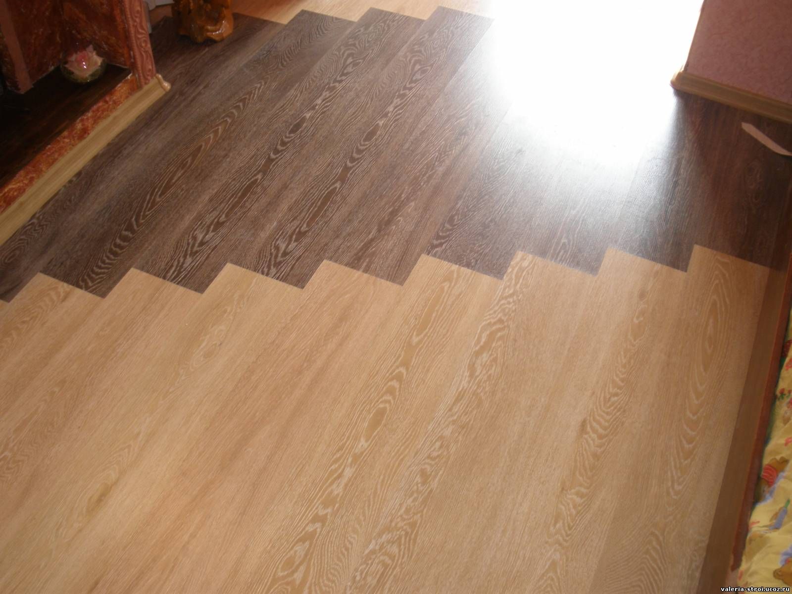 Diese Art der Verlegung der Diele verlängert den Raum optisch ein wenig, genau wie Spiegel. Dieser Ansatz erhöht die Länge des Korridors. In diesem Fall ist es oft notwendig, das Laminat mit Fliesen, Schwelle zu verbinden.