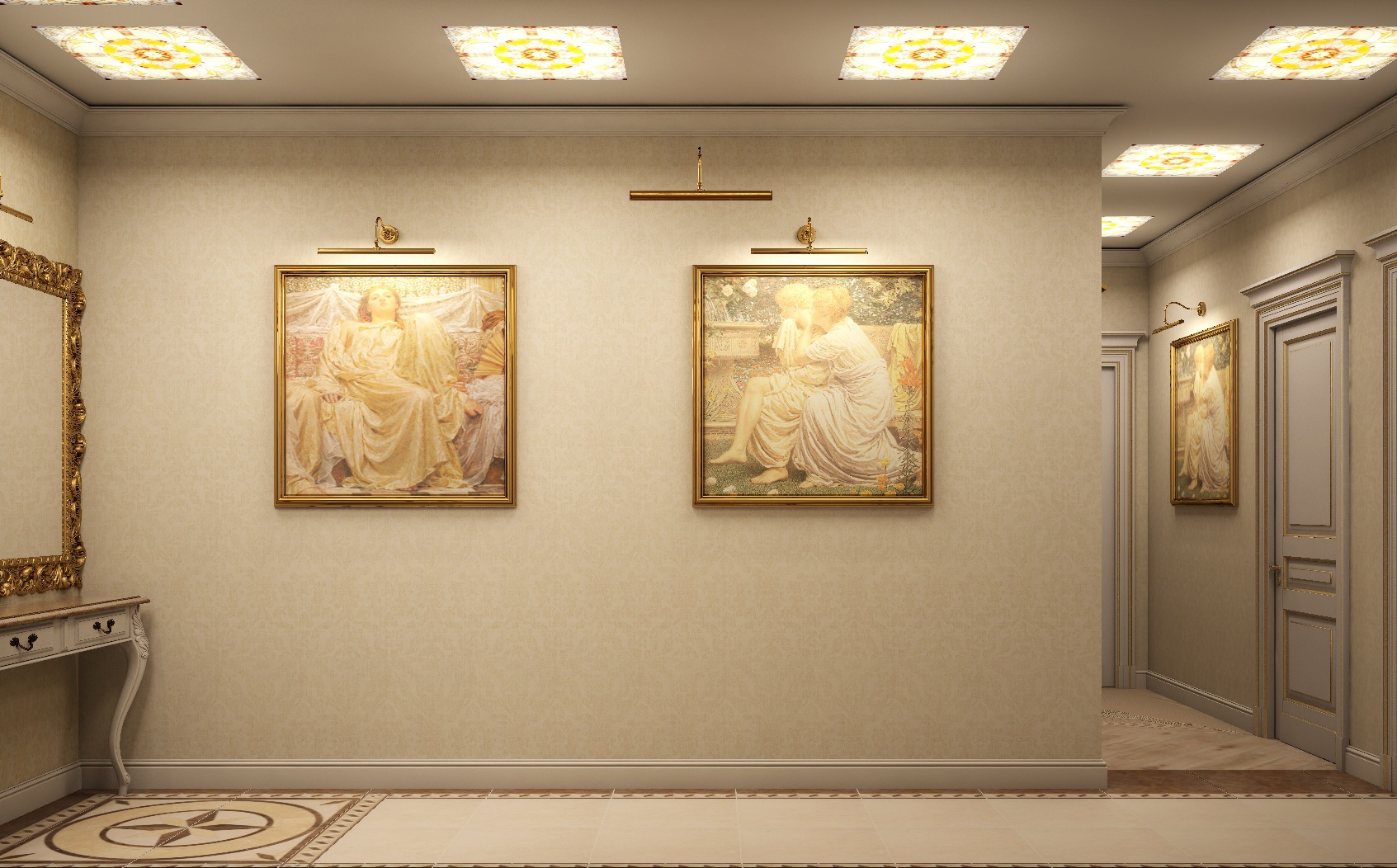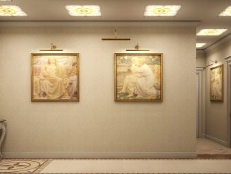 Eine interessante Option ist es, Bilder in Nischen zu platzieren. Die Beleuchtung für sie ist dort auch ausgestattet, zusätzliche Lampen sind an der Wand angebracht, stilistisch werden sie mit dem Bild kombiniert und wirken wie seine Fortsetzung.