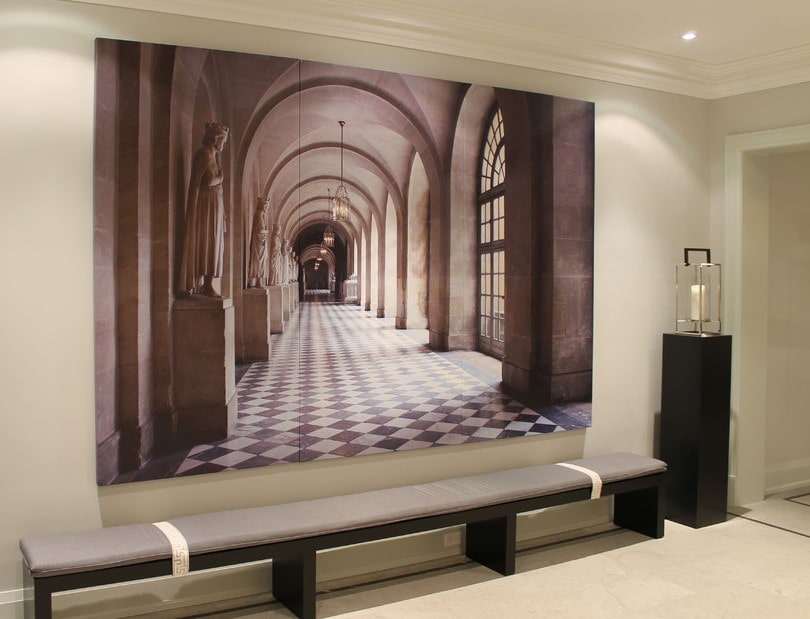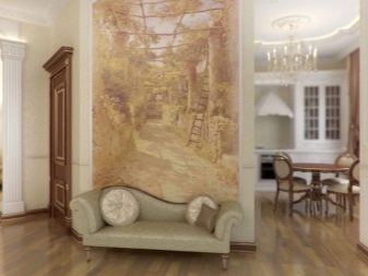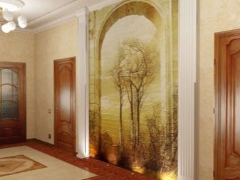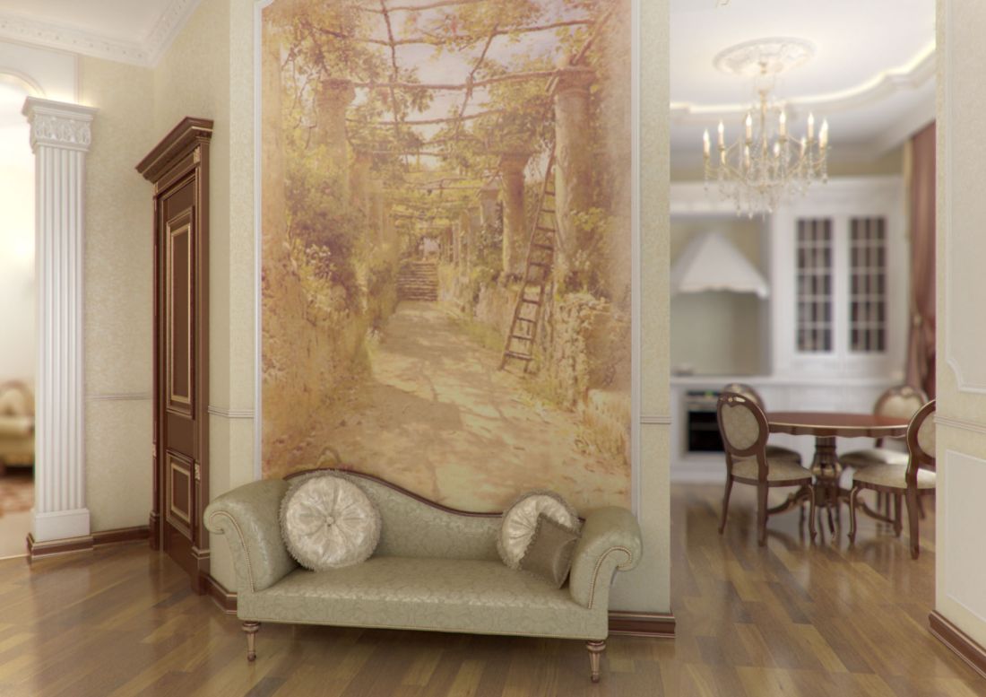 Eine vollständige Fototapete ist eine großartige Option, wenn Sie Platz haben. Dieses Dekor sieht majestätisch aus, besonders im Rahmen der Säulen. Passend für ein klassisches Interieur.