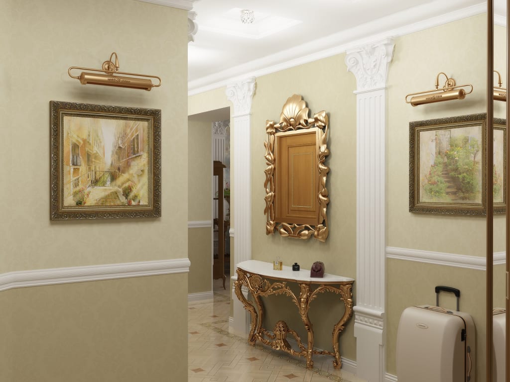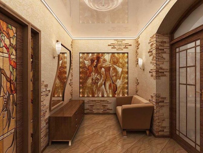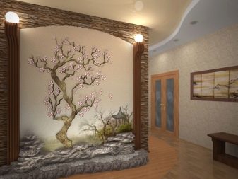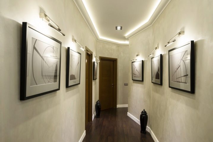 Lokale Beleuchtung kann verwendet werden, um die dekorative Komposition zu akzentuieren. Normalerweise ist es im Flur nicht zu hell, sodass zusätzliche Lampen nicht stören. Dies können sowohl kleine Lampen neben dem Bild als auch LED-Streifen entlang des Rahmens sein.