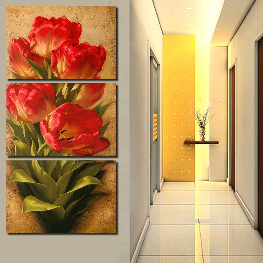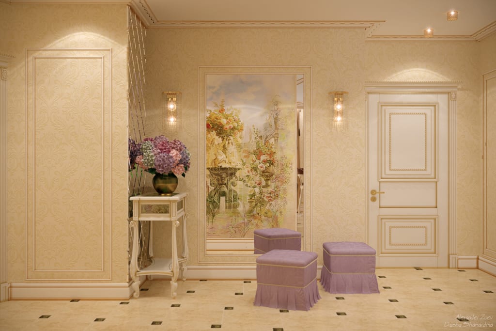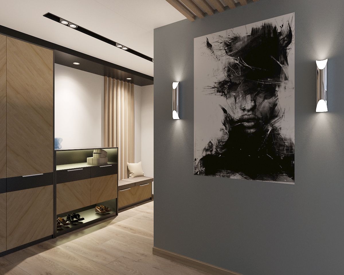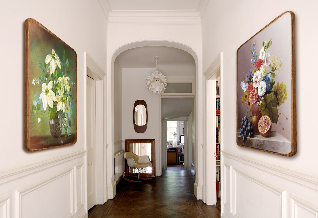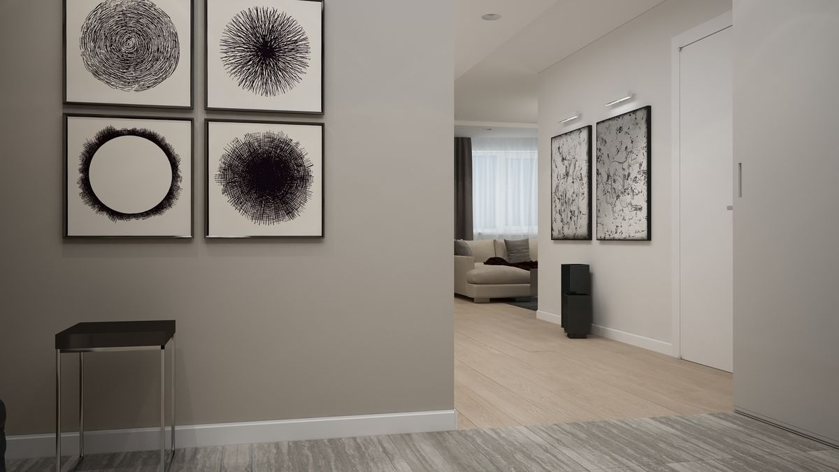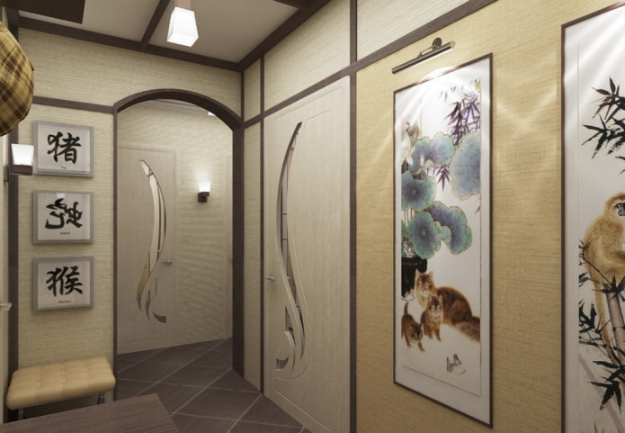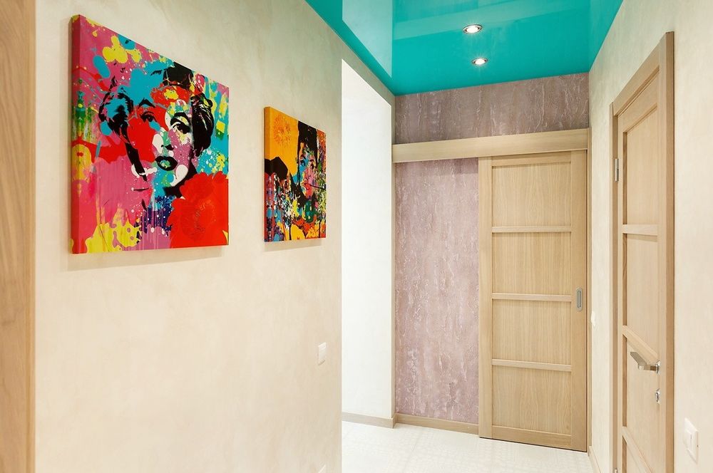 Längliche vertikale Leinwände machen die Decken optisch höher. Wenn im Flur nicht genug Platz ist, können Sie ein ähnliches Dekor verwenden.