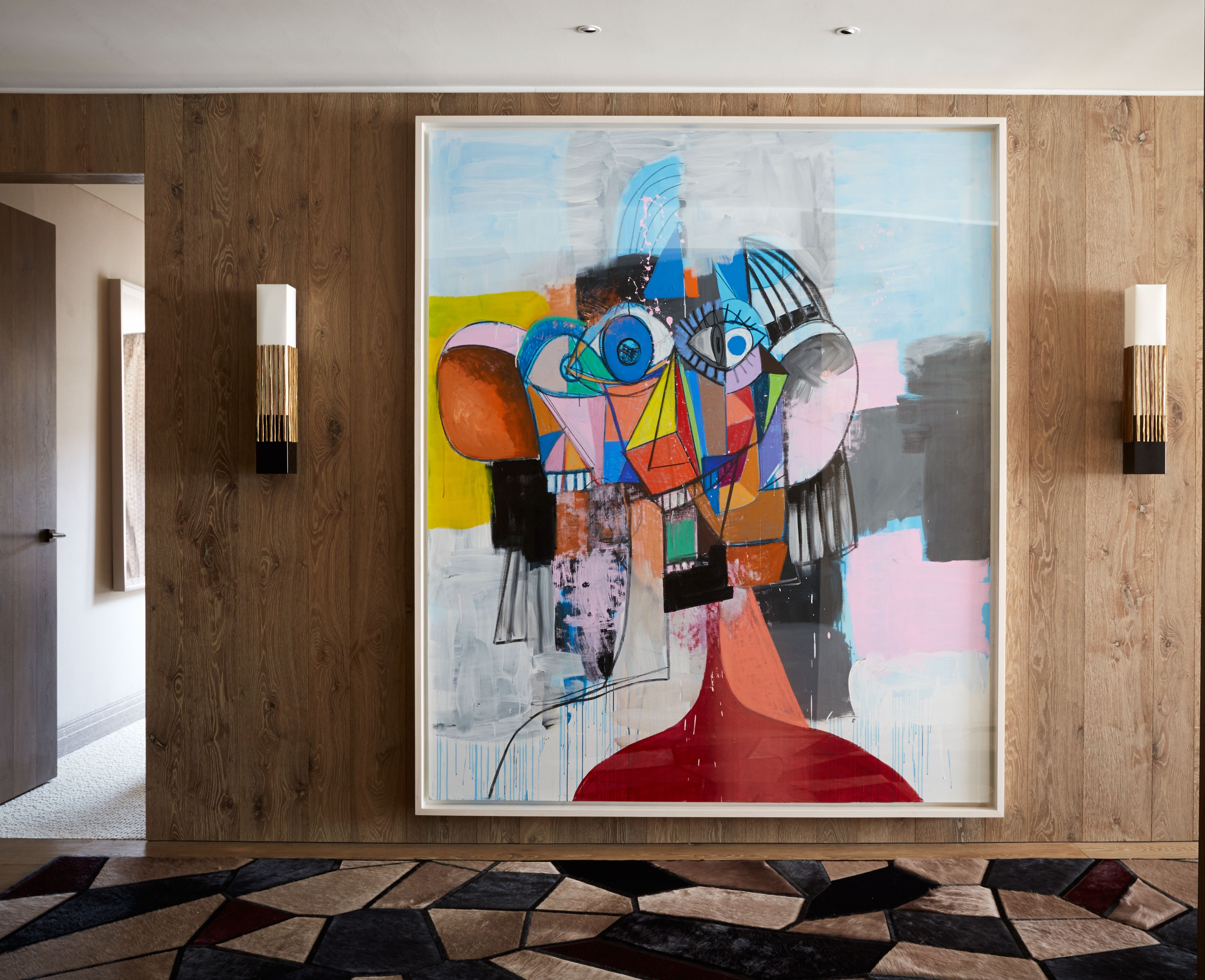 Der Bereich über der Kommode ist ein großartiger Ort für Gemälde. Sie sind in ihrem Maßstab recht hell, aber das Bild selbst ist unauffällig und die abgerundeten Linien verleihen ihm Ruhe.