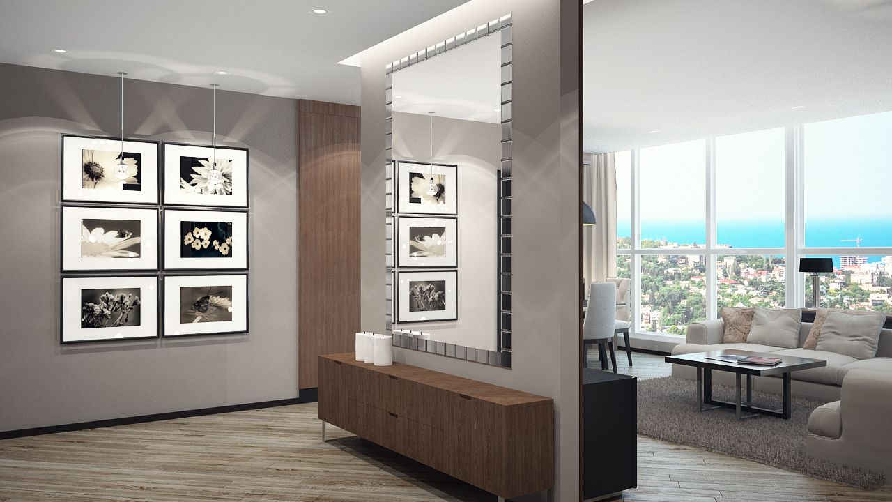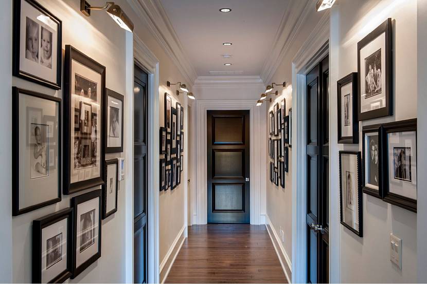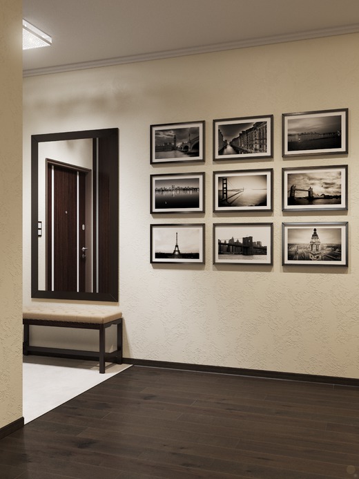 Berücksichtigen Sie auch die Besonderheiten des Raumes. In einem engen und langen Korridor lohnt es sich, vertikale und nicht horizontale Gemälde aufzuhängen, um den Raum nicht noch mehr zu dehnen. Quadratische Rahmen sind auch in Ordnung.