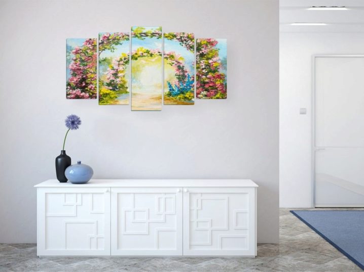 Ein modulares Bild mit hellen Farben dient als origineller Akzent in einem hellen Flur. Eine vernünftige Lösung besteht darin, die Leinwand genau an der nahen Wand zu platzieren und nicht in einem engen Flur, in dem die Zimmertüren hinausgehen - dort kann die Einrichtung die Mieter stören.