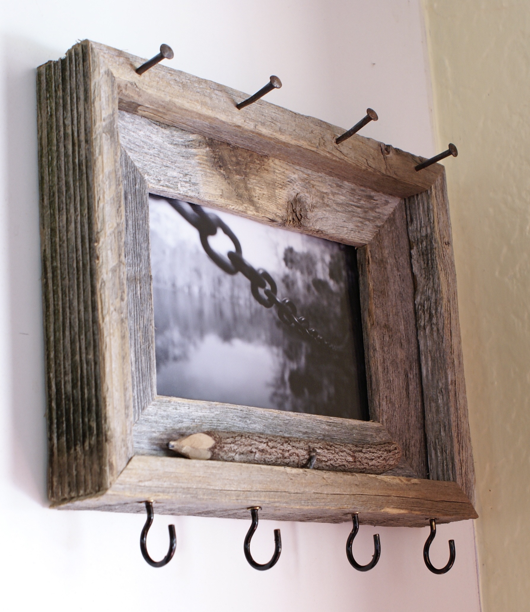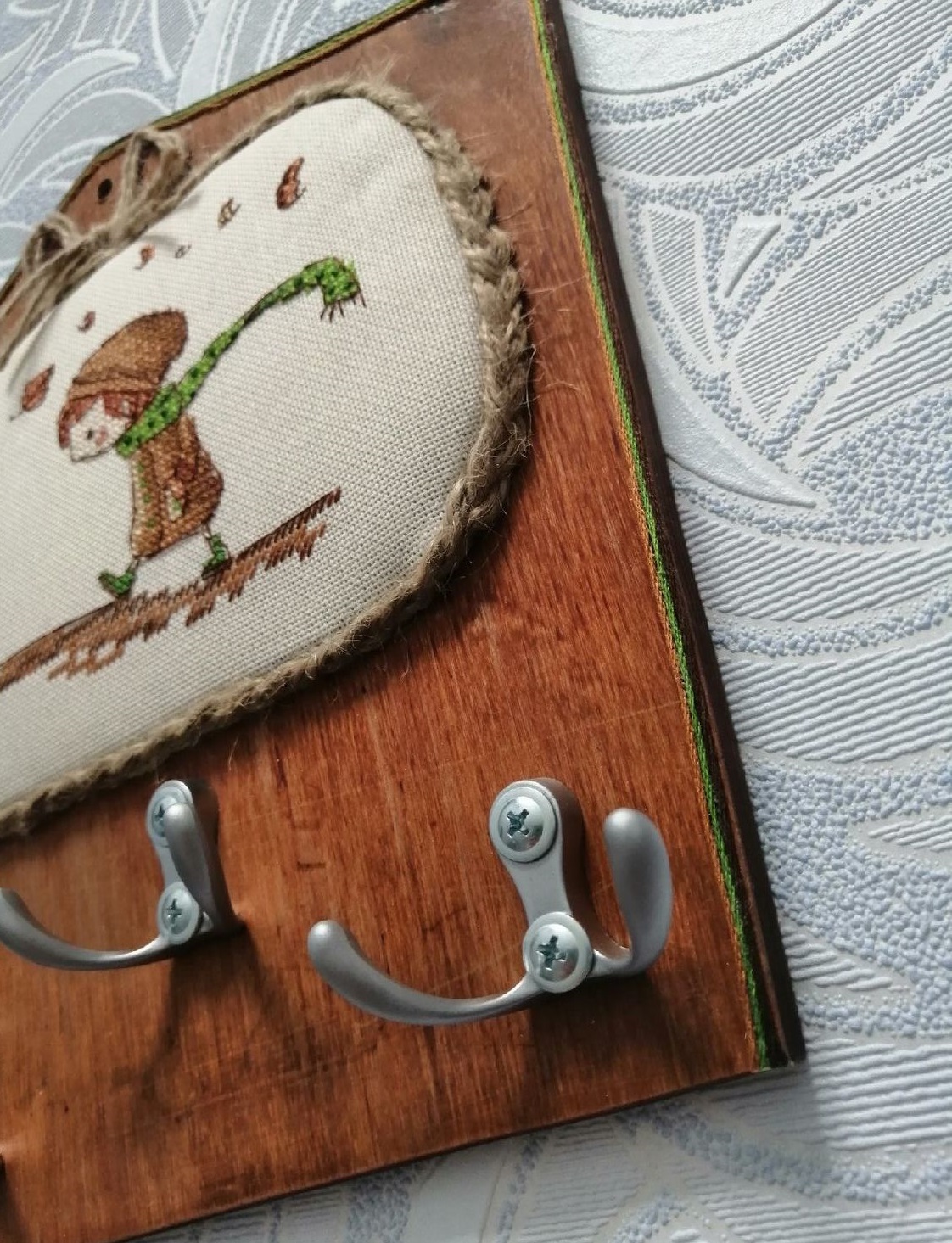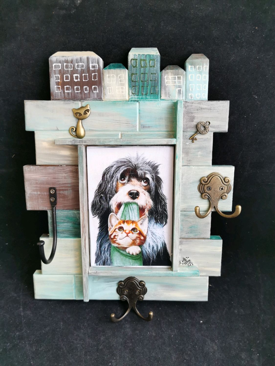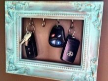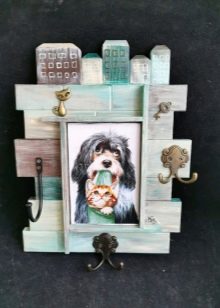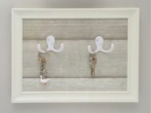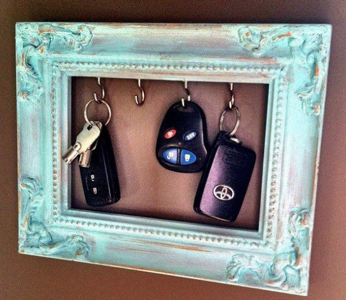 Ein Bilderrahmen in der richtigen Größe lässt sich mit minimalem Aufwand in eine außergewöhnliche Haushälterin verwandeln. Sperrholz eignet sich gut für den Untergrund, der bemalt, mit Decoupage oder Stoff dekoriert werden kann. Zierhaken werden in beliebiger Reihenfolge verschraubt - zufällig über die gesamte Oberfläche der Platte oder in einer Reihe.