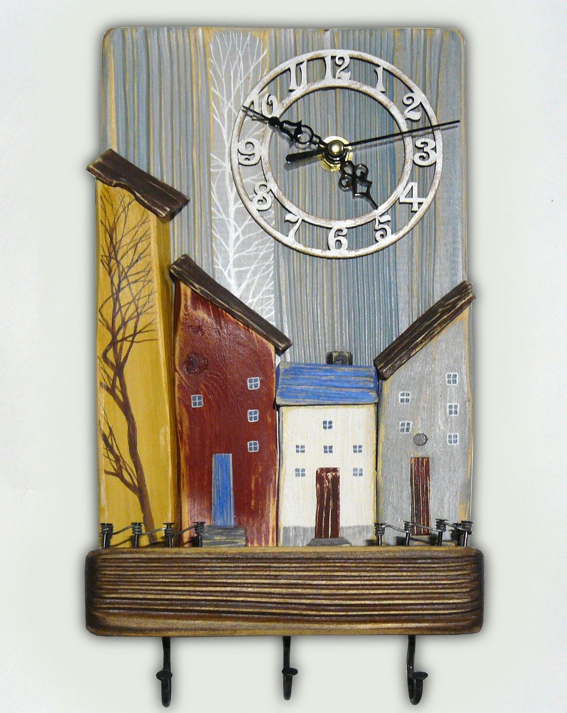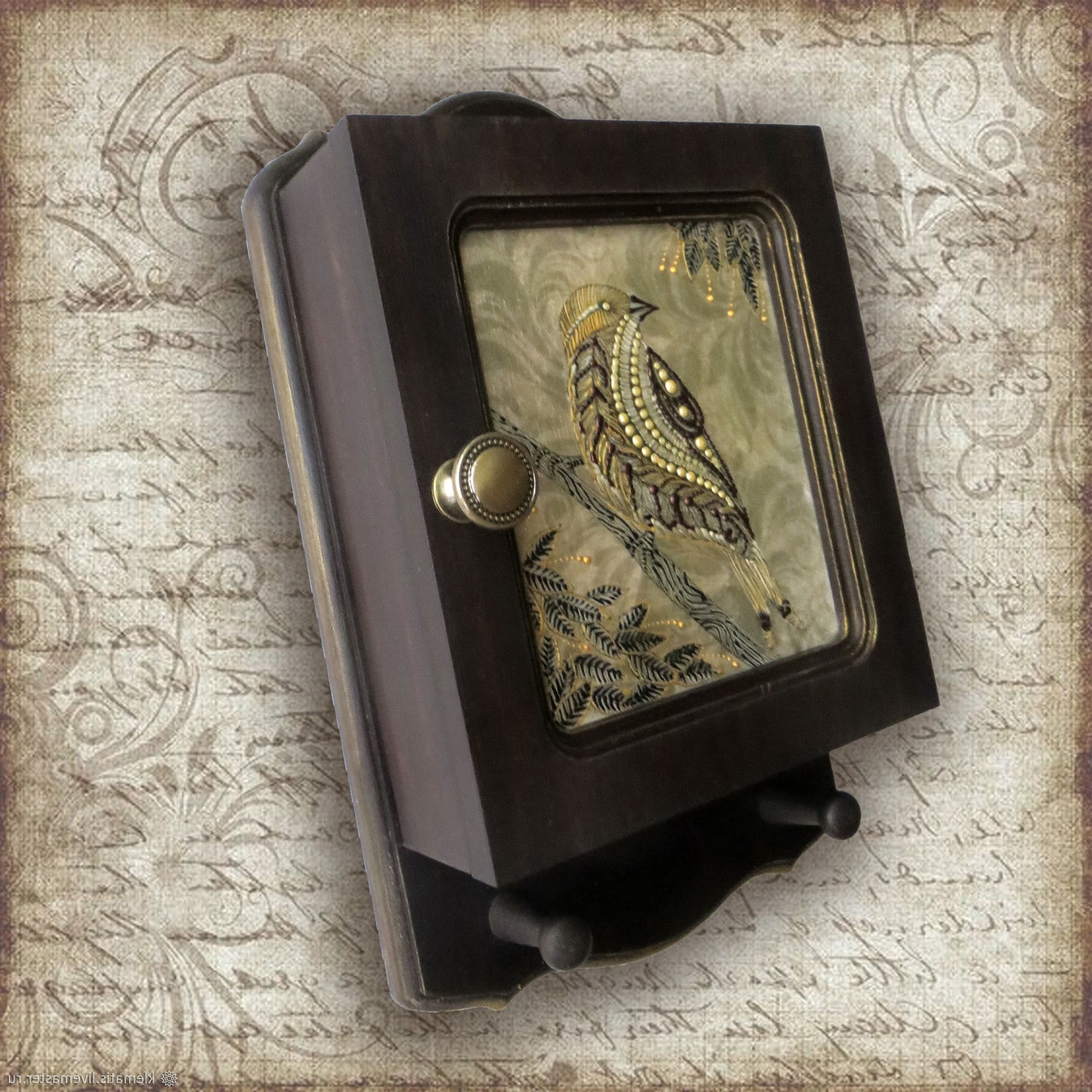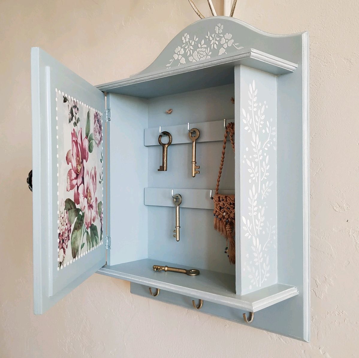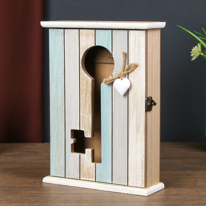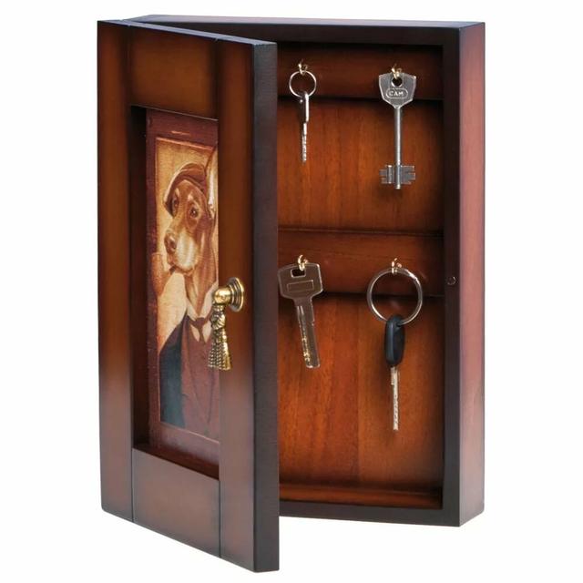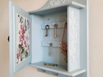 Bei ausreichenden Fähigkeiten lohnt es sich, einen geschlossenen Wandschlüsselhalter zu erstellen. Es ist einfacher, gemäß der im Web veröffentlichten Meisterklasse zu handeln. Der Prozess wird etwas mehr Zeit und Mühe in Anspruch nehmen, aber das Ergebnis wird anständig und attraktiv sein. Auf der Außenwand eines solchen Schranks sieht eine Fotocollage oder ein anderes Bild spektakulär aus. Zum Beispiel antike Schlüssel oder Uhren, die dem Design mehr Charme verleihen.