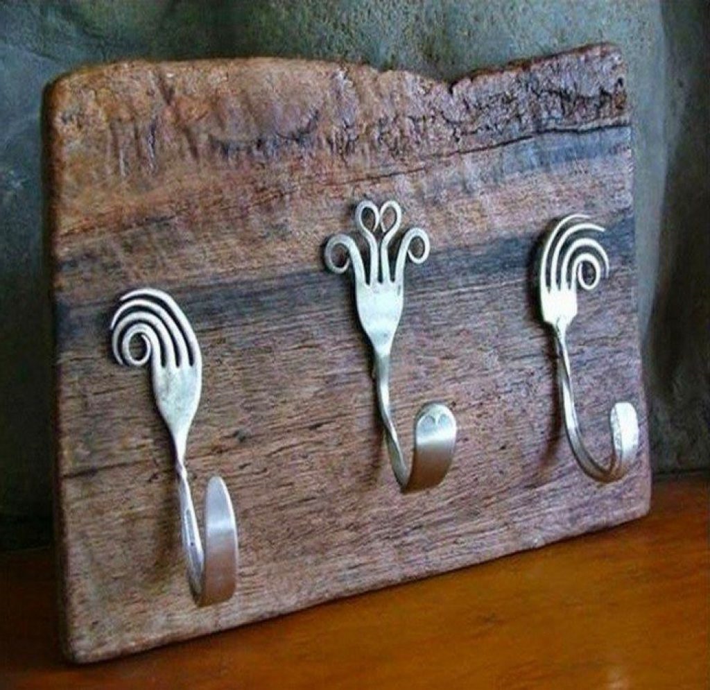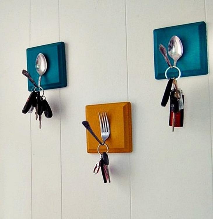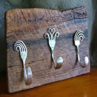 Sehr originelle Schlüsselanhänger werden aus unbrauchbaren Gabeln und Löffeln hergestellt. Sie müssen auch Befestigungselemente besorgen, eine Zange vorbereiten und, falls gewünscht, zur Dekoration malen. Es bleibt nur, die Geräte zu biegen, ihnen die Form von Haken zu geben und sie an der Produktebene oder an der Wand zu befestigen. Statt einer Sperrholz- oder Brettunterlage eignet sich ein Holzschneidebrett perfekt - eine harmonische Ergänzung im Geiste der Provence.