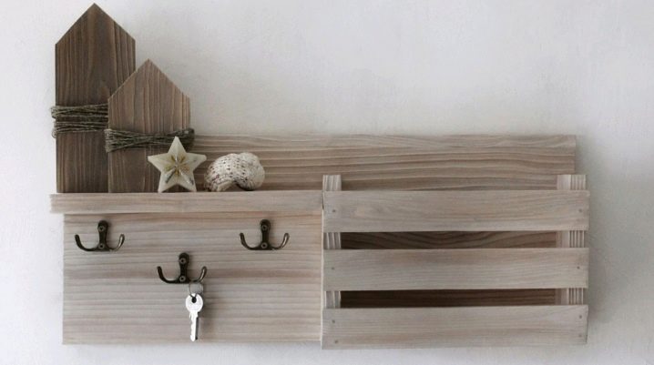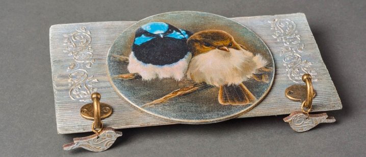 Auch eine gewöhnliche Box ist ein fast fertiger Originalschlüsselhalter mit Tür. Wenn es über eine Schnappvorrichtung verfügt, muss es mit Schlüsselhaken ergänzt und an die Wand hängen. Ein Miniaturschrank kann ganz einfach "gealtert", mit Farbe überzogen, mit Decoupage dekoriert und mit einer für den Innenraum geeigneten Tapete überklebt werden. Die natürliche Textur, akzentuiert durch transparenten Lack, sieht am Baum sehr stilvoll aus.