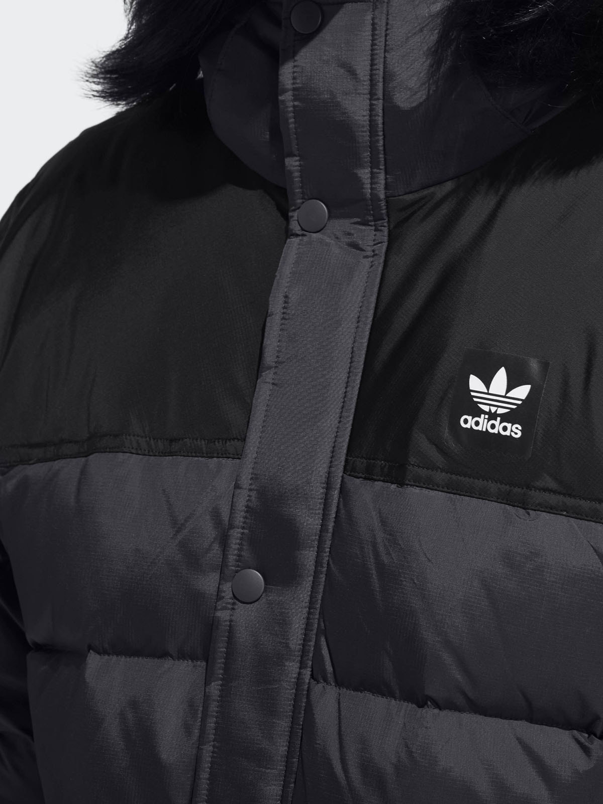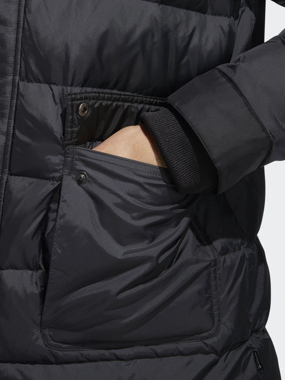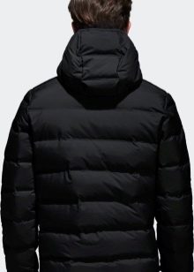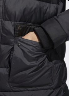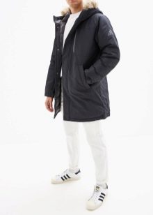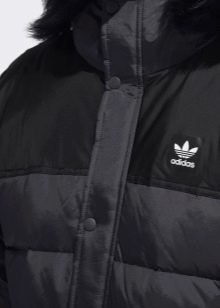 Die verkürzte Daunenjacke mit tailliertem Schnitt ist in Schwarz gehalten. Vordertaschen haben Reißverschlüsse und eine spezielle Öffnung für Kopfhörerkabel. Die geschlossene Kapuze mit hohem Kragen bedeckt das Kinn, sodass kein Schal benötigt wird. Der Kordelzug ist mit verstellbaren Kordeln ausgestattet. Die innovativen, gepolsterten Adidas Conextbaffles sind nahtlos mit dem Außenmaterial verbunden. Dies ist eine echte Innovation in der Modewelt. Keine Nähte bieten besseren Wetterschutz. Die Kosten für das Produkt betragen 10.999 Rubel.