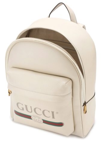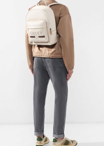 - Rucksack aus Leder mit Gucci-Print - der Artikel aus mattweißem Leder wurde in die Frühjahr-Sommer-Kollektion 2019 aufgenommen. Das Accessoire ist mit einem rot-grünen Band und einem Firmenlogo verziert. Die Kosten für das Produkt betragen 136.000 Rubel.