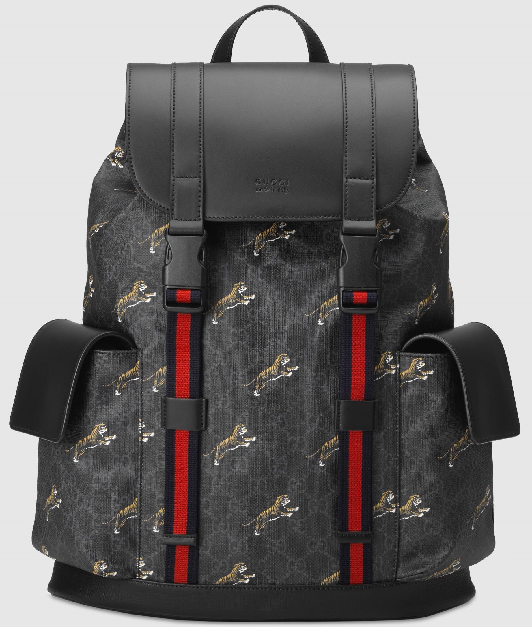 - GG Supreme Rucksack, verziert mit einem Tiger-Print (Alessandro Michele machte dieses Tier zum Symbol der Marke). Das Produkt besteht aus textilen Materialien und Polyurethan. Der Rucksack ist in der Herbst-Winter-Kollektion 2019 enthalten. Die Kosten betragen 128.000 Rubel.