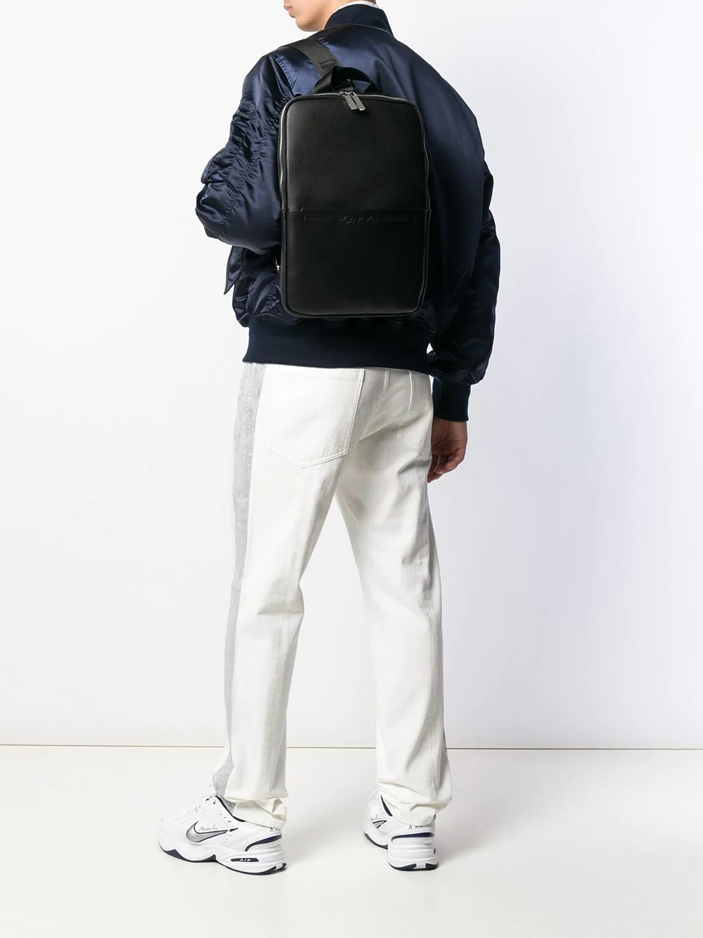 - Schwarzer Rucksack Perfekt zu beruhigenden Tönen (zum Beispiel marineblaue Jeans und ein hellgraues Sweatshirt).