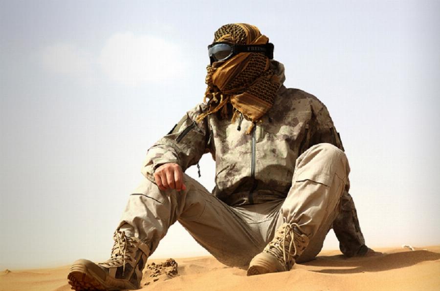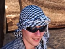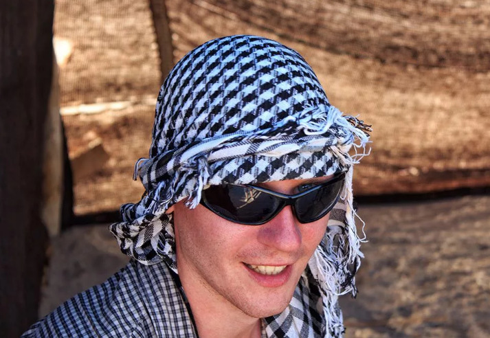 Eine arabische Kopftuchmaske ist für den Urlaub in arabischen Ländern relevant, die für ihre Sandstürme berühmt sind. Ergänzen Sie das Bild mit einer dunklen Brille.