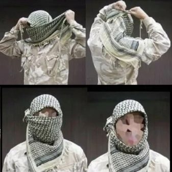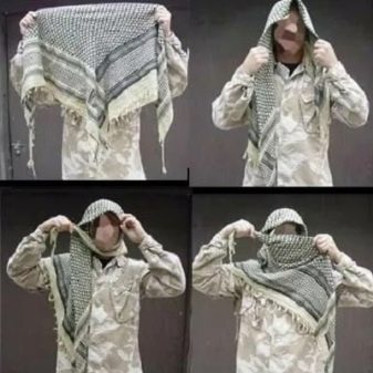 Araber raten zum Tragen eines palästinensischen Kopftuchs in Form eines Turbans. Jeder Mann hat jedoch das Recht, genau "seine" Option zu wählen. Eine andere Möglichkeit ist die Verwendung eines arabischen Kopftuchs in Form einer Maske. So können Sie Ihr Gesicht so gut wie möglich vor widrigen Wetterbedingungen schützen. Ihre Aktionen sind also wie folgt.