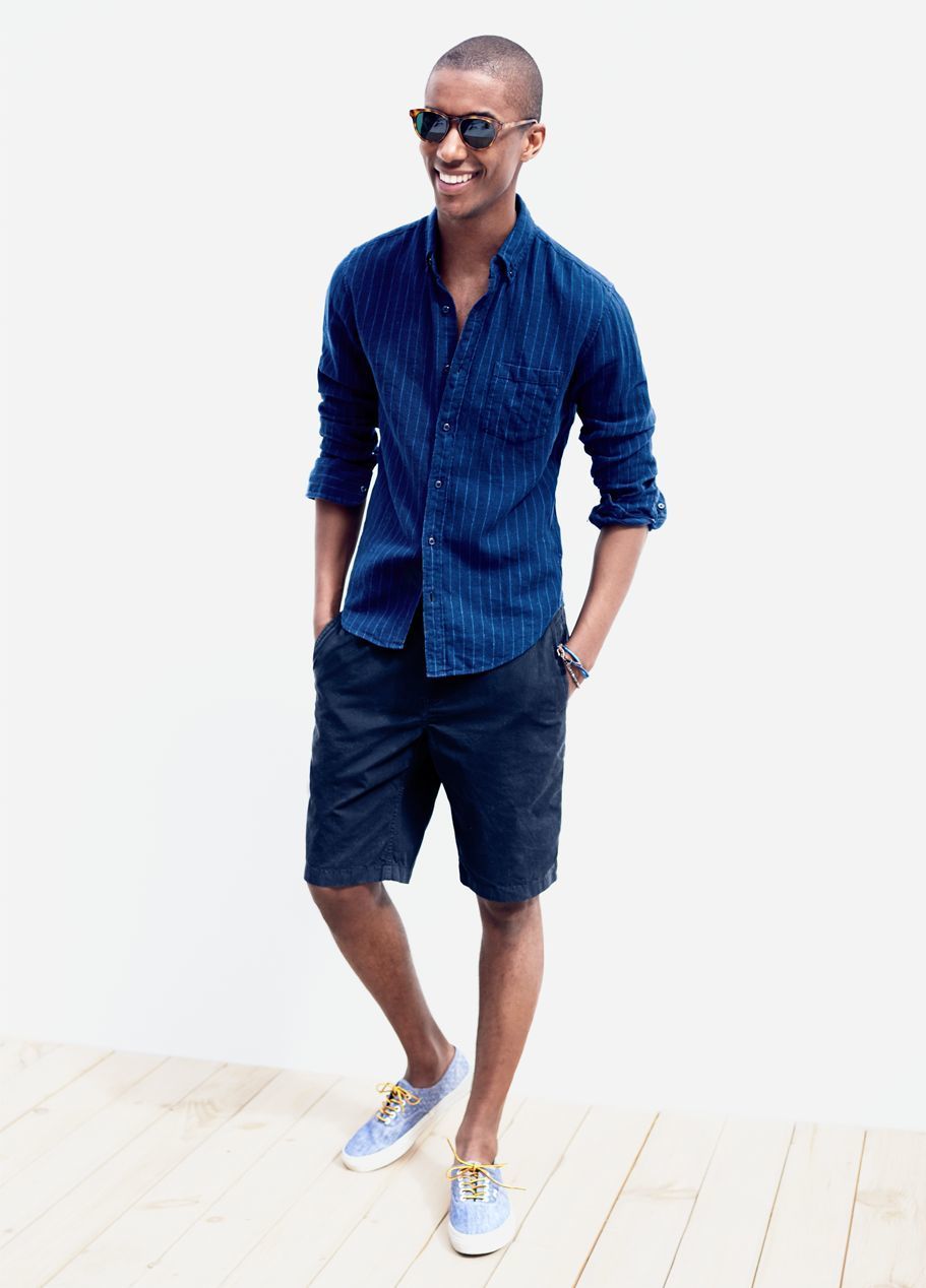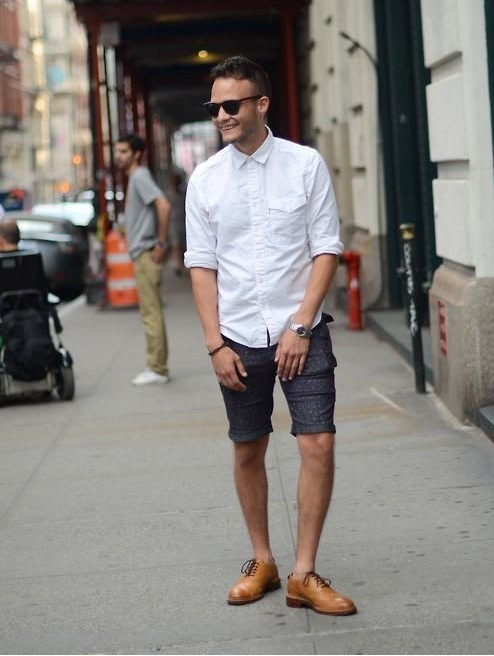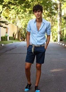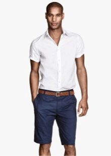 - Dunkelblaue Shorts in Kombination mit einem Hemd sind ein tolles Business-Set. Diese Option kann sogar als Anzug für die Arbeit verwendet werden, wenn es der Dresscode im Büro zulässt.